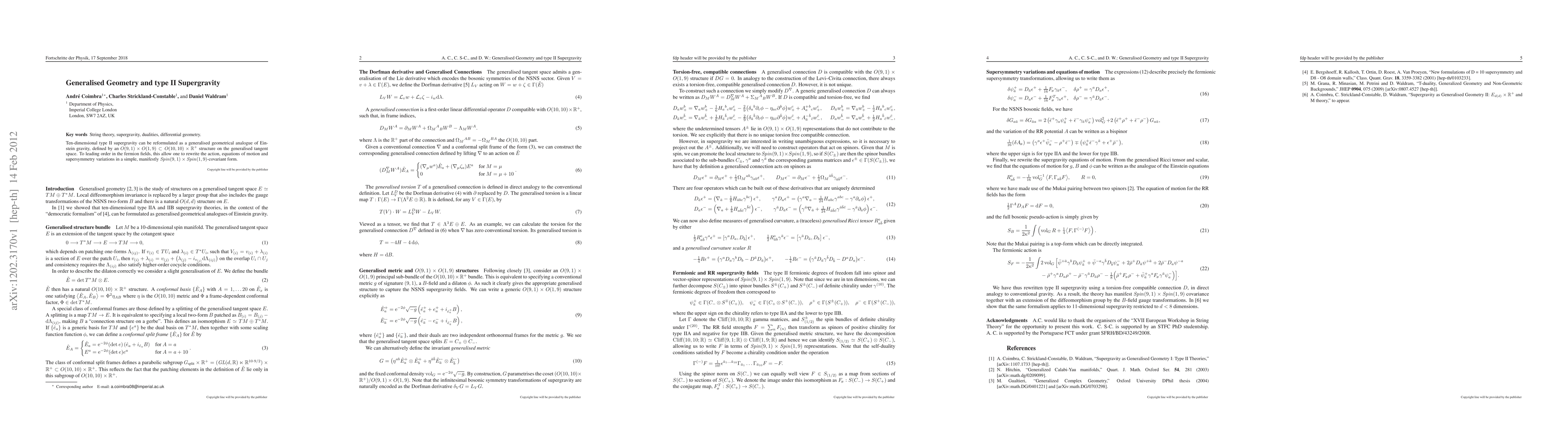 Ten-dimensional type II supergravity can be reformulated as a generalised geometrical analogue of Einstein gravity, defined by an $O(9,1)\times O(1,9)\subset O(10,10)\times\mathbb{R}^+$ structure on the generalised tangent space. To leading order in the fermion fields, this allow one to rewrite the action, equations of motion and supersymmetry variations in a simple, manifestly $Spin(9,1)\times Spin(1,9)$-covariant form.
