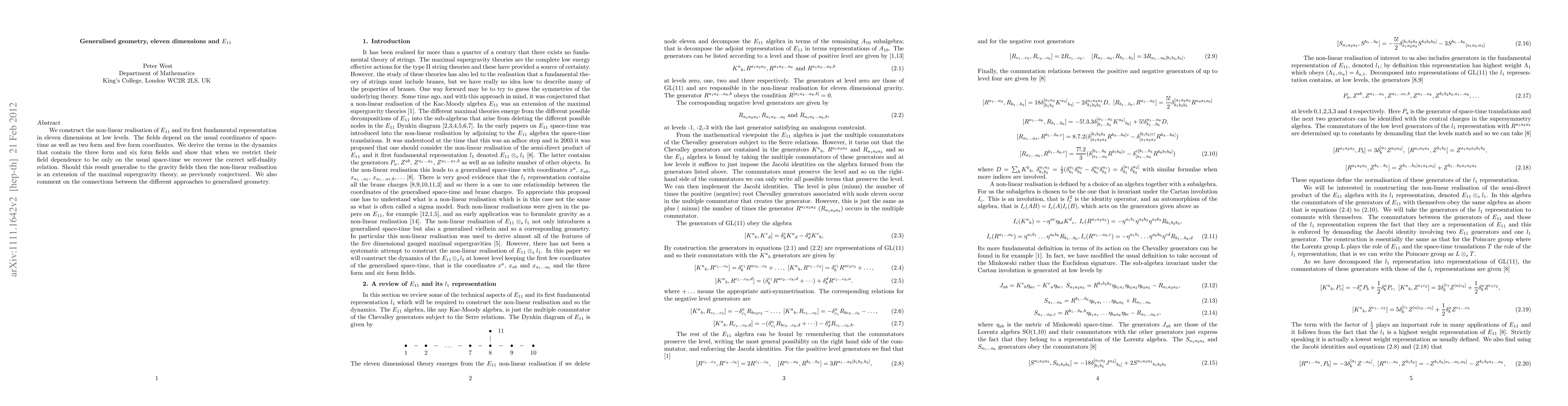 We construct the non-linear realisation of E11 and its first fundamental representation in eleven dimensions at low levels. The fields depend on the usual coordinates of space-time as well as two form and five form coordinates. We derive the terms in the dynamics that contain the three form and six form fields and show that when we restricted their field dependence to be only on the usual space-time we recover the correct self-duality relation. Should this result generalise to the gravity fields then the non-linear realisation is an extension of the maximal supergravity theory, as previously conjectured. We also comment on the connections between the different approaches to generalised geometry.