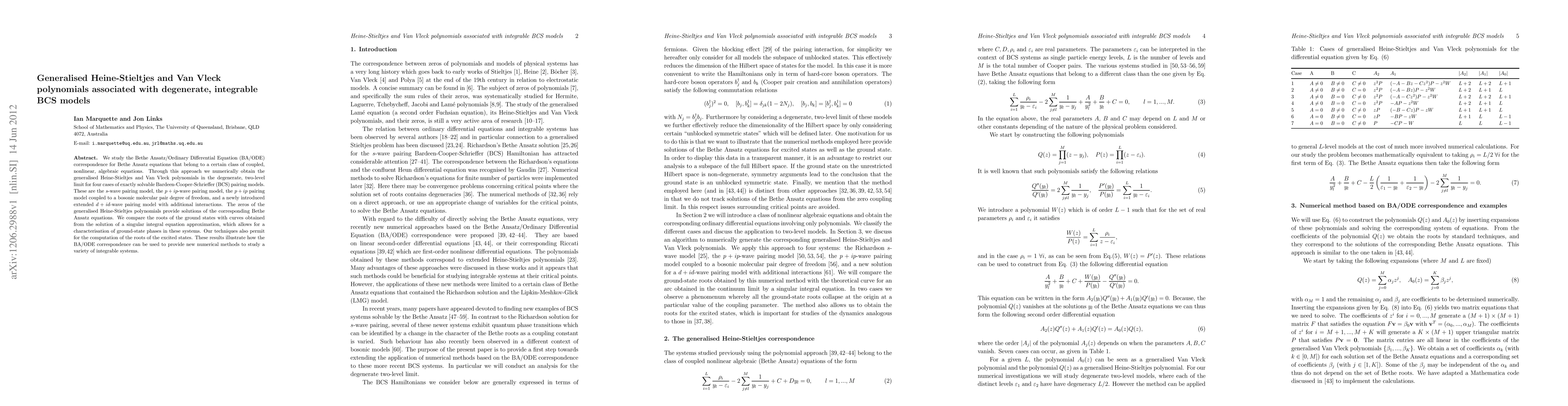 This paper explores the Bethe Ansatz/Ordinary Differential Equation correspondence for solving Bethe Ansatz equations in integrable BCS models, deriving generalised Heine-Stieltjes and Van Vleck polynomials for four specific BCS pairing models. The study compares the zeros of these polynomials with solutions from a singular integral equation, providing insights into ground-state phases and excited states.