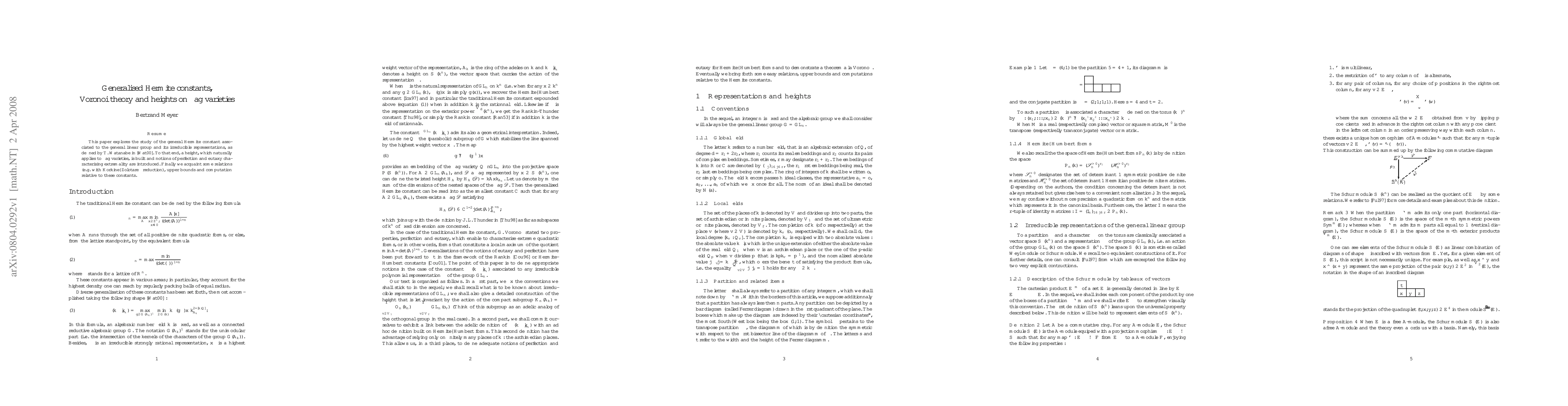 This paper explores the study of the general Hermite constant associated to the general linear group and its irreducible representations, as defined by T. Watanabe. To that end, a height, which naturally applies to flag varieties, is built and notions of perfection and eutaxy characterising extremality are introduced. Finally we acquaint some relations (e.g. with Korkine--Zolotareff reduction), upper bounds and computation relative to these constants.