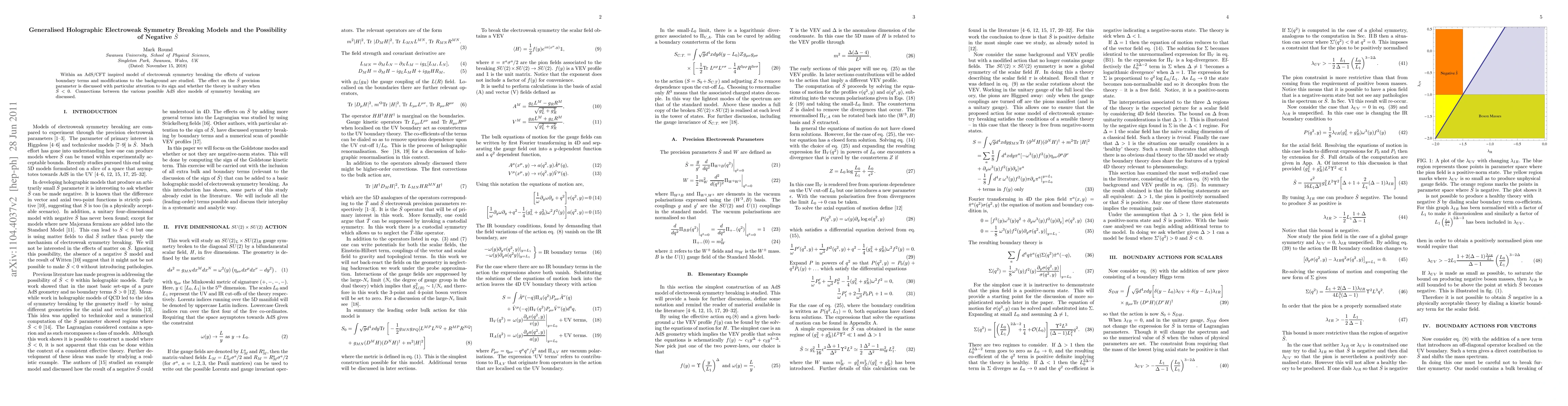 This paper explores AdS/CFT-inspired models of electroweak symmetry breaking, focusing on boundary terms and background modifications, and investigates the implications for the S parameter, particularly its negativity and the theory's unitarity when S<0. It also examines the relationships between different AdS slice models.