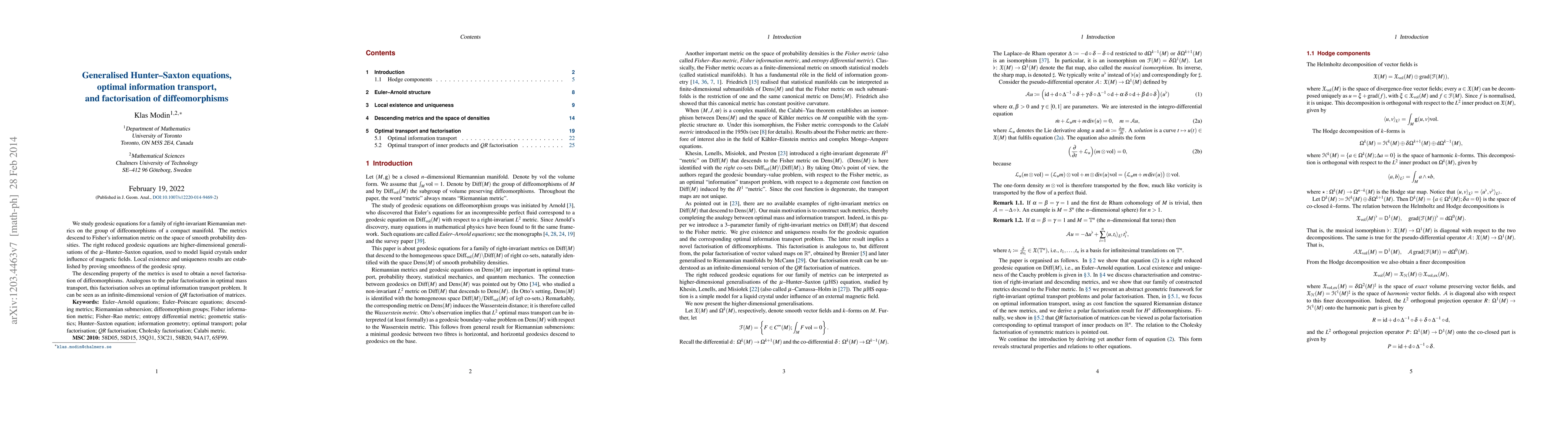 We study geodesic equations for a family of right-invariant Riemannian metrics on the group of diffeomorphisms of a compact manifold. The metrics descend to Fisher's information metric on the space of smooth probability densities. The right reduced geodesic equations are higher-dimensional generalisations of the $\mu$--Hunter--Saxton equation, used to model liquid crystals under influence of magnetic fields. Local existence and uniqueness results are established by proving smoothness of the geodesic spray. The descending property of the metrics is used to obtain a novel factorisation of diffeomorphisms. Analogous to the polar factorisation in optimal mass transport, this factorisation solves an optimal information transport problem. It can be seen as an infinite-dimensional version of $QR$ factorisation of matrices.