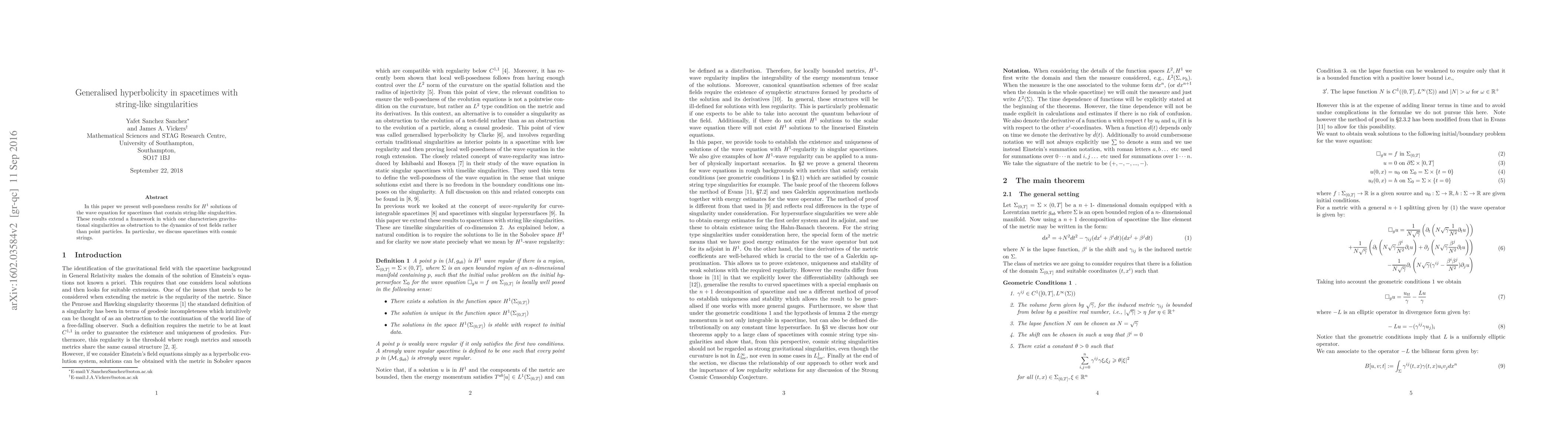 This paper establishes well-posedness of the wave equation in certain spacetimes with string-like singularities, extending a framework to characterize gravitational singularities as obstructions to test field dynamics.