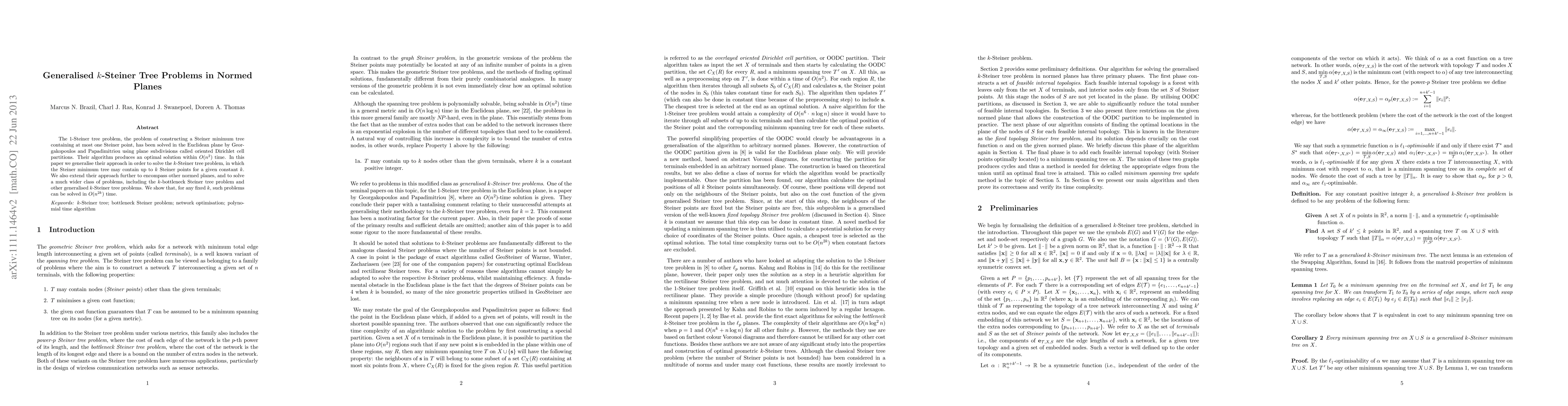 The 1-Steiner tree problem, the problem of constructing a Steiner minimum tree containing at most one Steiner point, has been solved in the Euclidean plane by Georgakopoulos and Papadimitriou using plane subdivisions called oriented Dirichlet cell partitions. Their algorithm produces an optimal solution within $O(n^2)$ time. In this paper we generalise their approach in order to solve the $k$-Steiner tree problem, in which the Steiner minimum tree may contain up to $k$ Steiner points for a given constant $k$. We also extend their approach further to encompass other normed planes, and to solve a much wider class of problems, including the $k$-bottleneck Steiner tree problem and other generalised $k$-Steiner tree problems. We show that, for any fixed $k$, such problems can be solved in $O(n^{2k})$ time.