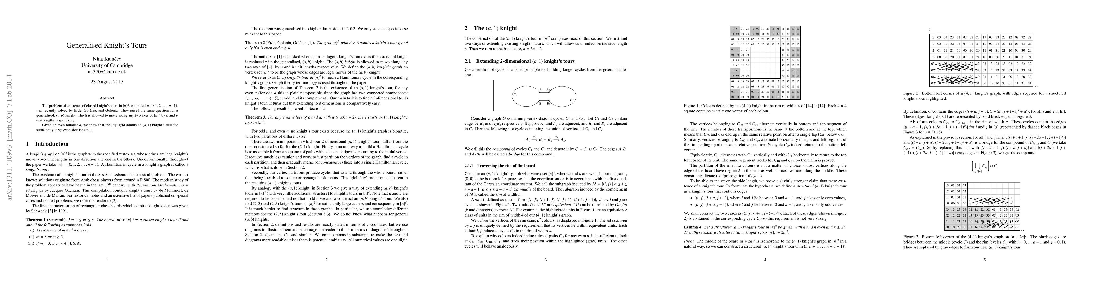The problem of existence of closed knight's tours in $[n]^d$, where $[n]=\{0, 1, \dots, n-1\}$, was recently solved by Erde, Gol\'{e}nia, and Gol\'{e}nia. They raised the same question for a generalised, $(a, b)$ knight, which is allowed to move along any two axes of $[n]^d$ by $a$ and $b$ unit lengths respectively. Given an even number $a$, we show that the $[n]^d$ grid admits an $(a, 1)$ knight's tour for sufficiently large even side length $n$.