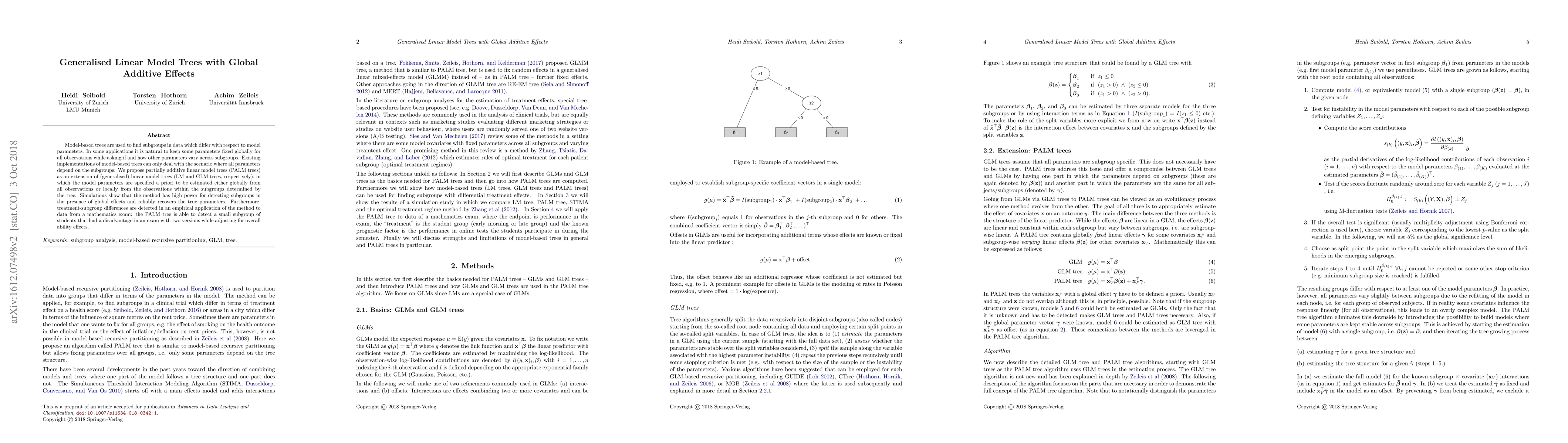 Model-based trees are used to find subgroups in data which differ with respect to model parameters. In some applications it is natural to keep some parameters fixed globally for all observations while asking if and how other parameters vary across subgroups. Existing implementations of model-based trees can only deal with the scenario where all parameters depend on the subgroups. We propose partially additive linear model trees (PALM trees) as an extension of (generalised) linear model trees (LM and GLM trees, respectively), in which the model parameters are specified a priori to be estimated either globally from all observations or locally from the observations within the subgroups determined by the tree. Simulations show that the method has high power for detecting subgroups in the presence of global effects and reliably recovers the true parameters. Furthermore, treatment-subgroup differences are detected in an empirical application of the method to data from a mathematics exam: the PALM tree is able to detect a small subgroup of students that had a disadvantage in an exam with two versions while adjusting for overall ability effects.