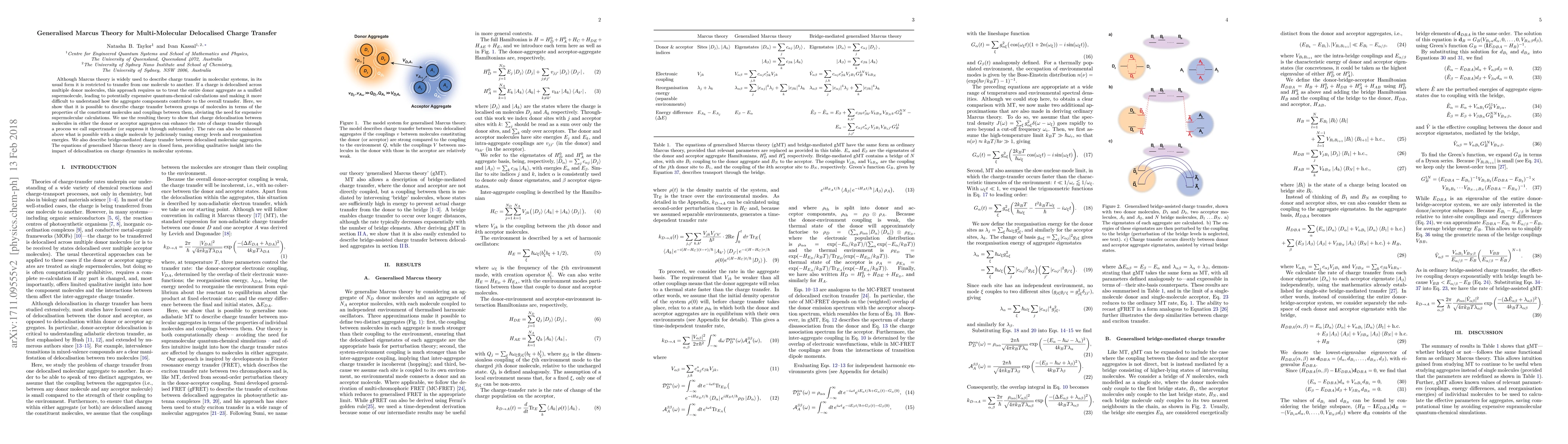 This research introduces a generalised Marcus theory for charge transfer in multi-molecular systems, allowing description of charge transfer between groups of molecules using constituent molecule properties and couplings. It reveals that charge delocalisation can enhance or suppress transfer rates, and judicious tuning of energy levels can boost transfer rates beyond single-molecule limits. The theory also covers bridge-mediated transfer between delocalised aggregates, offering closed-form equations for understanding molecular system charge dynamics.