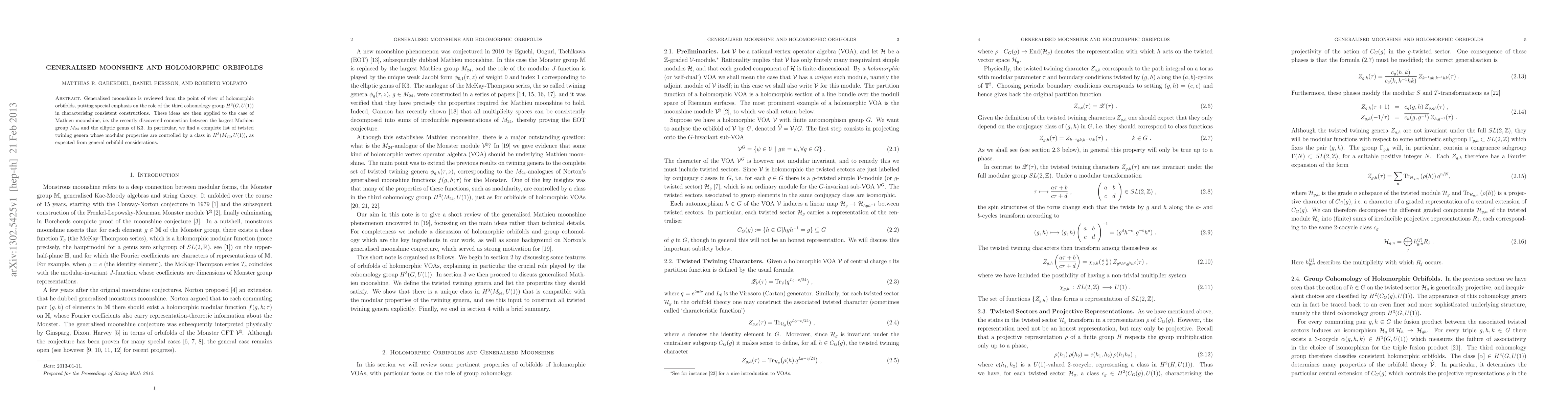 Summary: This paper reviews generalised moonshine through the lens of holomorphic orbifolds, highlighting the significance of the third cohomology group in defining consistent constructions. It applies these ideas to Mathieu moonshine, finding a complete list of twisted twining genera whose modular properties are governed by classes in H^3(M_24, U(1)).