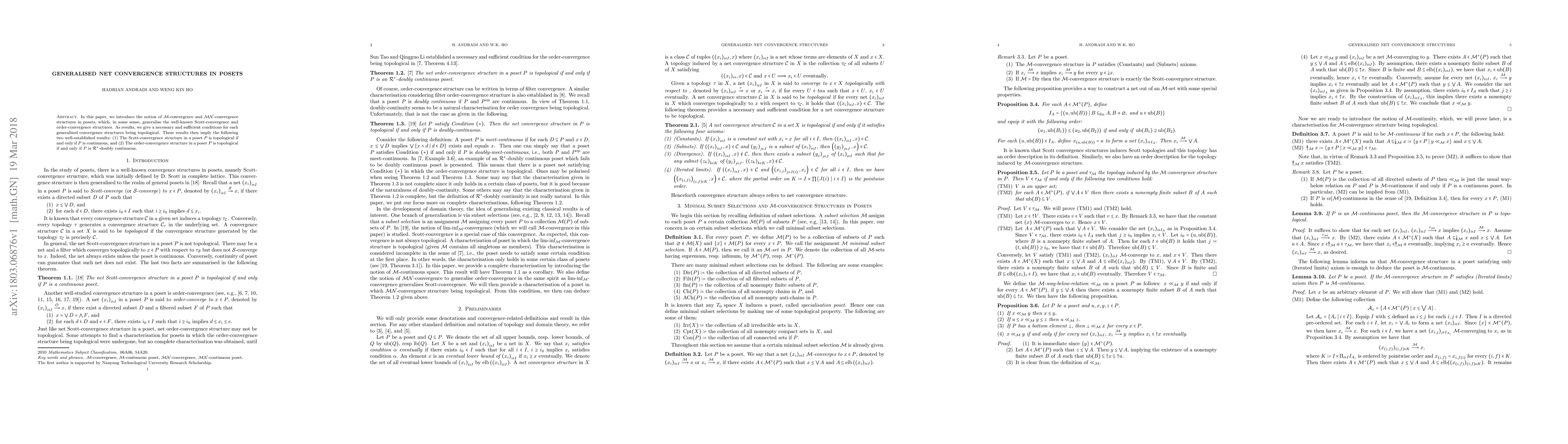 In this paper, we introduce the notion of $\mathcal{M}$-convergence and $\mathcal{MN}$-convergence structures in posets, which, in some sense, generalise the well-known Scott-convergence and order-convergence structures. As results, we give a necessary and sufficient conditions for each generalised convergence structures being topological. These results then imply the following two well-established results: (1) The Scott-convergence structure in a poset $P$ is topological if and only if $P$ is continuous, and (2) The order-convergence structure in a poset $P$ is topological if and only if $P$ is $\mathcal{R}^*$-doubly continuous.