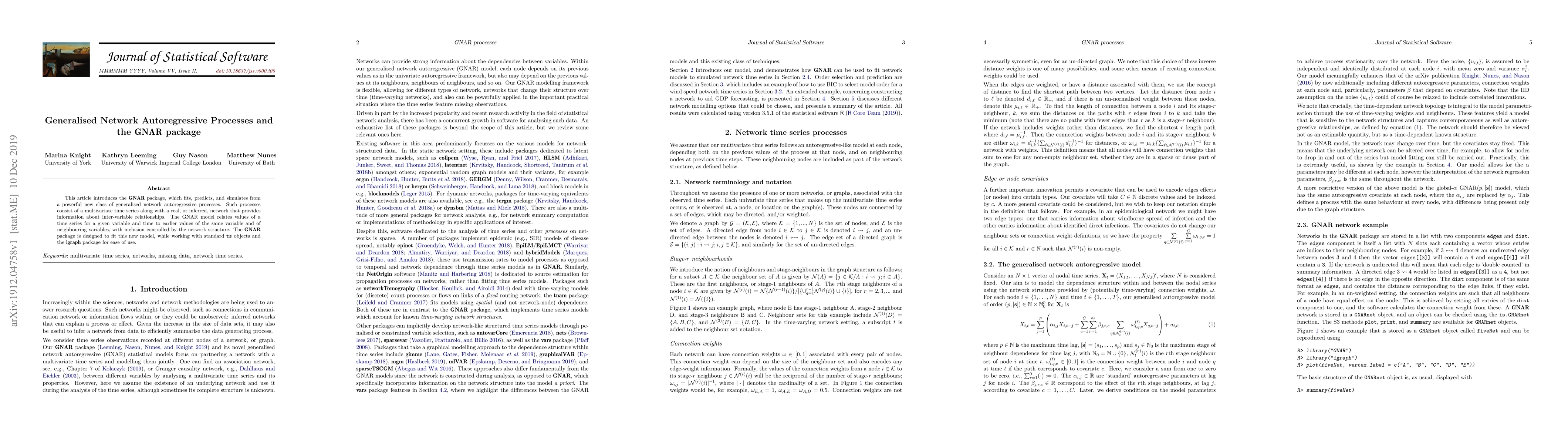 This article introduces the GNAR package, which fits, predicts, and simulates from a powerful new class of generalised network autoregressive processes. Such processes consist of a multivariate time series along with a real, or inferred, network that provides information about inter-variable relationships. The GNAR model relates values of a time series for a given variable and time to earlier values of the same variable and of neighbouring variables, with inclusion controlled by the network structure. The GNAR package is designed to fit this new model, while working with standard ts objects and the igraph package for ease of use.