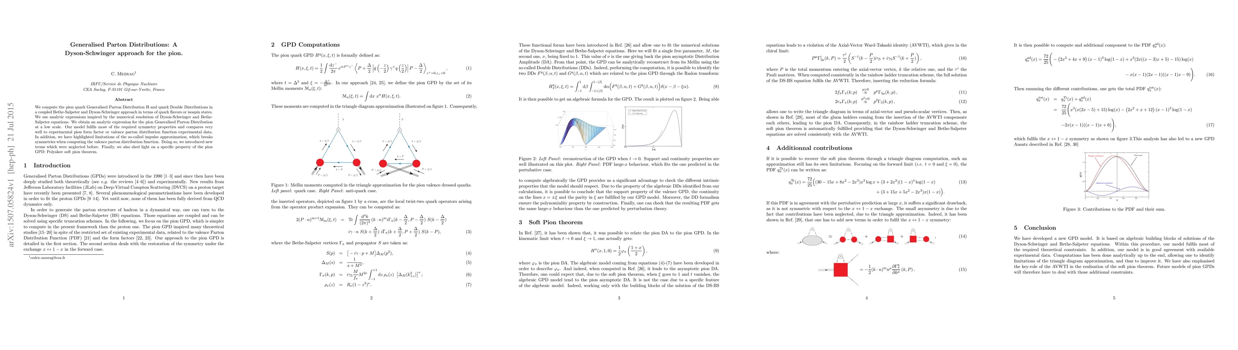 This paper uses a Dyson-Schwinger approach combined with the Bethe-Salpeter equation to compute pion quark Generalised Parton Distributions (GPDs) and Double Distributions, achieving good agreement with experimental data. It highlights the limitations of the impulse approximation and introduces new terms to better respect symmetry properties.