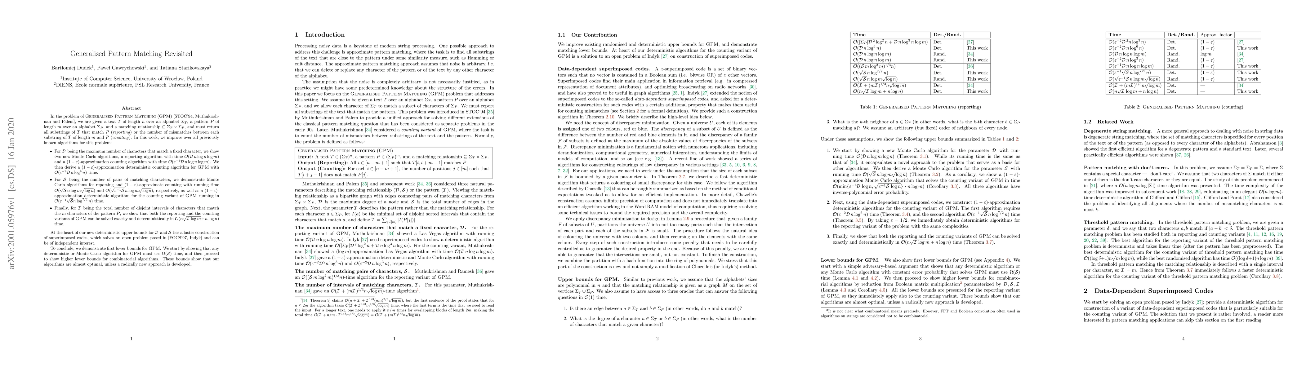 This paper improves algorithms for Generalised Pattern Matching (GPM), achieving better performance for various input parameters. It introduces a faster construction of superimposed codes, resolving an open problem, and provides tight lower bounds, demonstrating that current algorithms are nearly optimal.