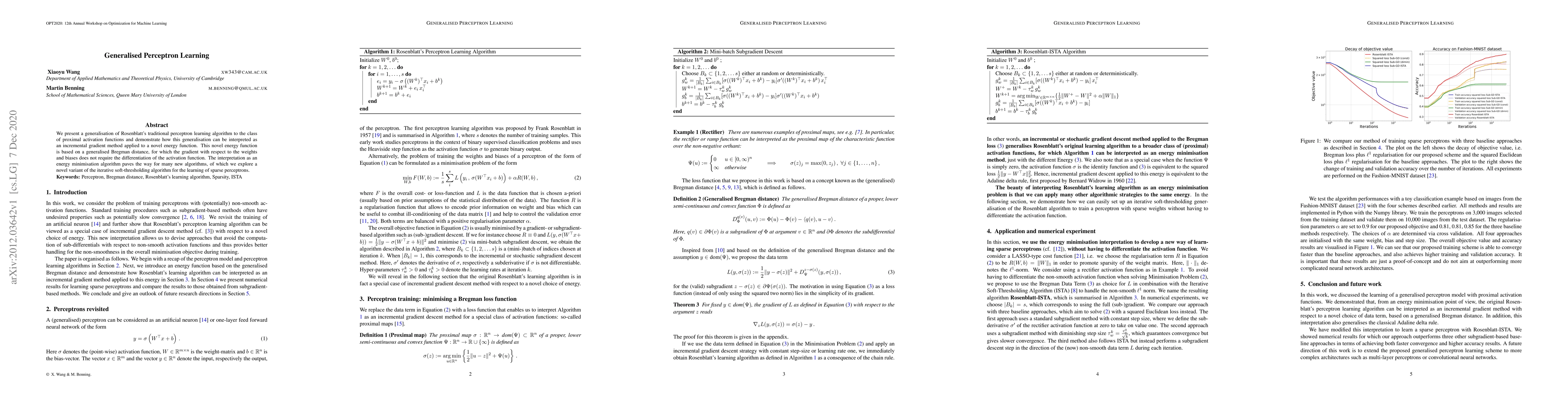 We present a generalisation of Rosenblatt's traditional perceptron learning algorithm to the class of proximal activation functions and demonstrate how this generalisation can be interpreted as an incremental gradient method applied to a novel energy function. This novel energy function is based on a generalised Bregman distance, for which the gradient with respect to the weights and biases does not require the differentiation of the activation function. The interpretation as an energy minimisation algorithm paves the way for many new algorithms, of which we explore a novel variant of the iterative soft-thresholding algorithm for the learning of sparse perceptrons.