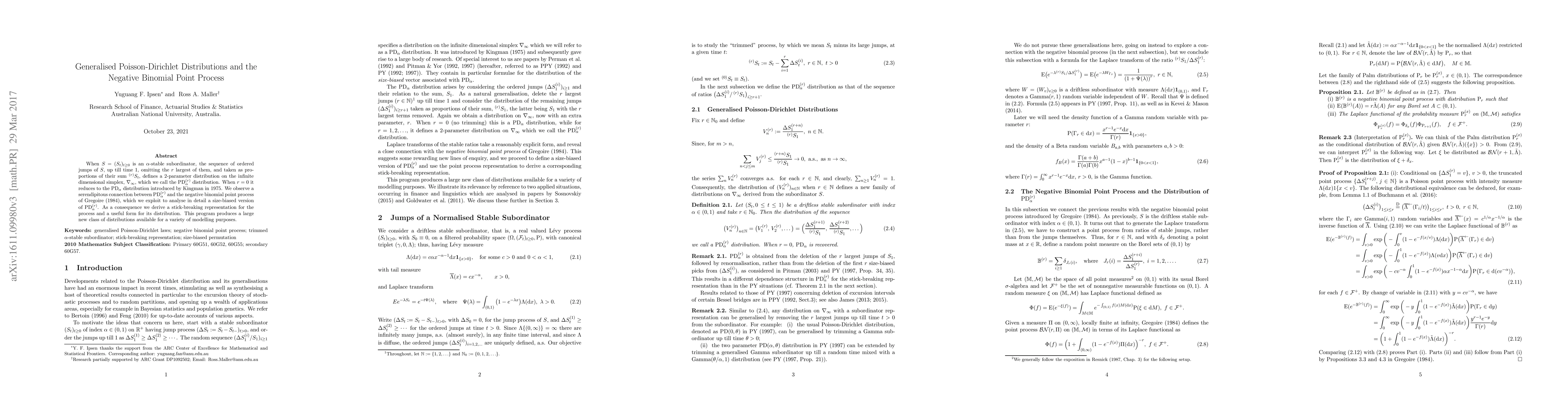 When $S=(S_t)_{t\ge 0}$ is an $\alpha$-stable subordinator, the sequence of ordered jumps of $S$, up till time $1$, omitting the $r$ largest of them, and taken as proportions of their sum $^{(r)}S_t$, defines a 2-parameter distribution on the infinite dimensional simplex, $\nabla_{\infty}$, which we call the $\mathrm{PD}_\alpha^{(r)}$ distribution. When $r=0$ it reduces to the $\mathrm{PD}_\alpha$ distribution introduced by Kingman in 1975. We observe a serendipitous connection between $\mathrm{PD}_\alpha^{(r)}$ and the negative binomial point process of Gregoire (1984), which we exploit to analyse in detail a size-biased version of $\mathrm{PD}_\alpha^{(r)}$. As a consequence we derive a stick-breaking representation for the process and a useful form for its distribution. This program produces a large new class of distributions available for a variety of modelling purposes.