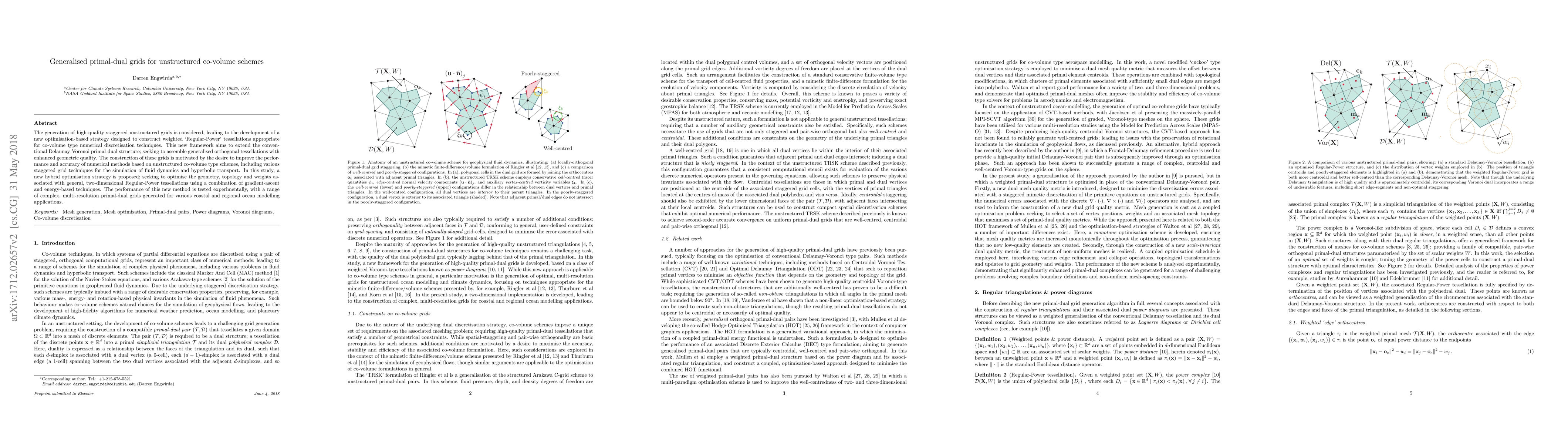 The generation of high-quality staggered unstructured grids is considered, leading to the development of a new optimisation-based strategy designed to construct weighted `Regular-Power' tessellations appropriate for co-volume type numerical discretisation techniques. This new framework aims to extend the conventional Delaunay-Voronoi primal-dual structure; seeking to assemble generalised orthogonal tessellations with enhanced geometric quality. The construction of these grids is motivated by the desire to improve the performance and accuracy of numerical methods based on unstructured co-volume type schemes, including various staggered grid techniques for the simulation of fluid dynamics and hyperbolic transport. In this study, a new hybrid optimisation strategy is proposed; seeking to optimise the geometry, topology and weights associated with general, two-dimensional Regular-Power tessellations using a combination of gradient-ascent and energy-based techniques. The performance of this new method is tested experimentally, with a range of complex, multi-resolution primal-dual grids generated for various coastal and regional ocean modelling applications.