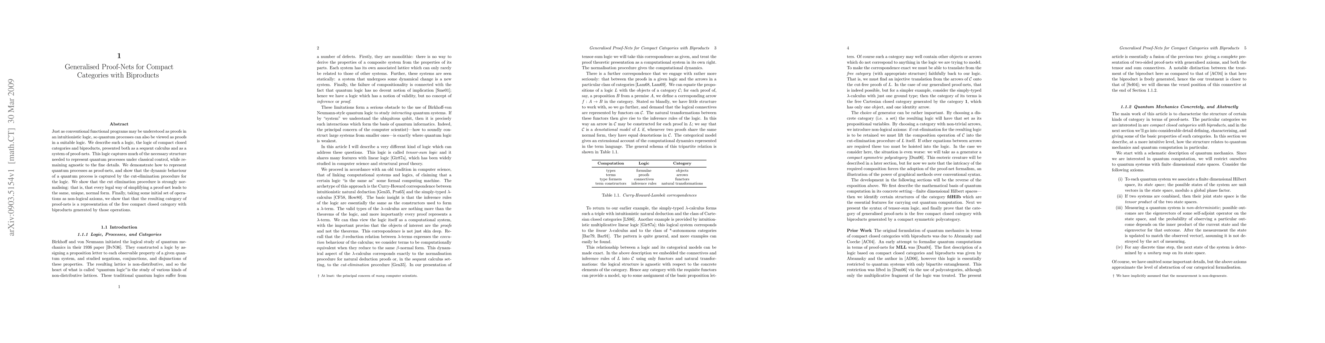 Just as conventional functional programs may be understood as proofs in an intuitionistic logic, so quantum processes can also be viewed as proofs in a suitable logic. We describe such a logic, the logic of compact closed categories and biproducts, presented both as a sequent calculus and as a system of proof-nets. This logic captures much of the necessary structure needed to represent quantum processes under classical control, while remaining agnostic to the fine details. We demonstrate how to represent quantum processes as proof-nets, and show that the dynamic behaviour of a quantum process is captured by the cut-elimination procedure for the logic. We show that the cut elimination procedure is strongly normalising: that is, that every legal way of simplifying a proof-net leads to the same, unique, normal form. Finally, taking some initial set of operations as non-logical axioms, we show that that the resulting category of proof-nets is a representation of the free compact closed category with biproducts generated by those operations.