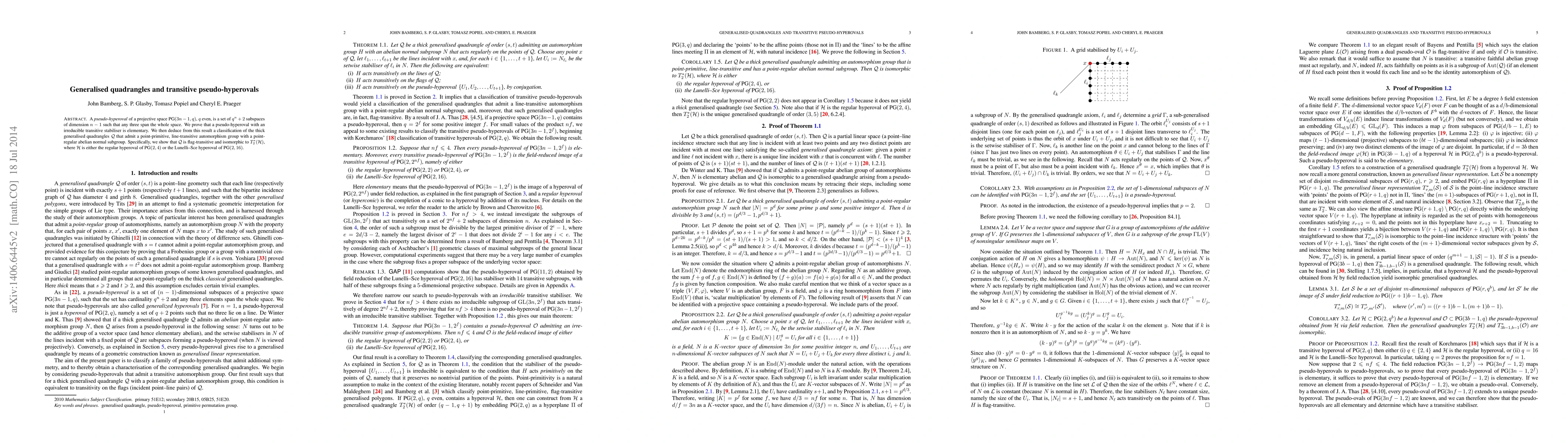 A pseudo-hyperoval of a projective space $\PG(3n-1,q)$, $q$ even, is a set of $q^n+2$ subspaces of dimension $n-1$ such that any three span the whole space. We prove that a pseudo-hyperoval with an irreducible transitive stabiliser is elementary. We then deduce from this result a classification of the thick generalised quadrangles $\mathcal{Q}$ that admit a point-primitive, line-transitive automorphism group with a point-regular abelian normal subgroup. Specifically, we show that $\mathcal{Q}$ is flag-transitive and isomorphic to $T_2^*(\mathcal{H})$, where $\mathcal{H}$ is either the regular hyperoval of $\PG(2,4)$ or the Lunelli--Sce hyperoval of $\PG(2,16)$.