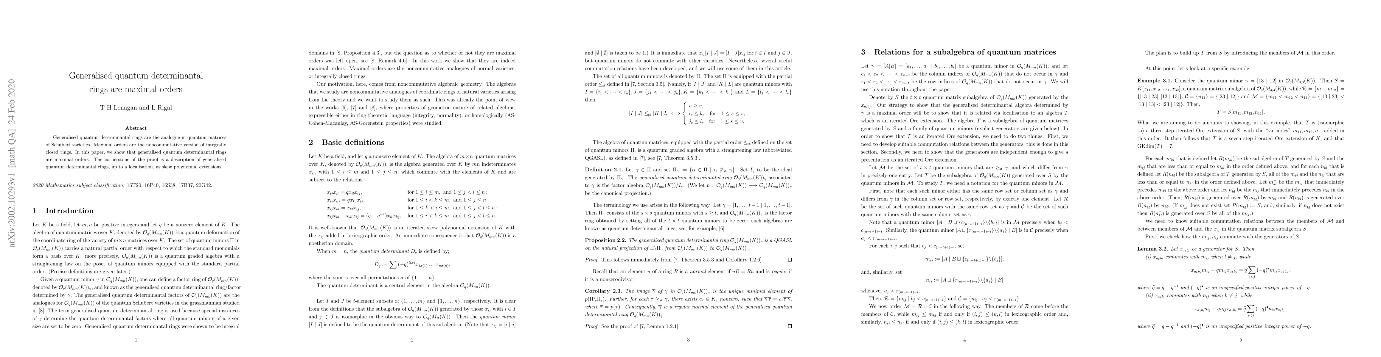 Generalised quantum determinantal rings are the analogue in quantum matrices of Schubert varieties. Maximal orders are the noncommutative version of integrally closed rings. In this paper, we show that generalised quantum determinantal rings are maximal orders. The cornerstone of the proof is a description of generalised quantum determinantal rings, up to a localisation, as skew polynomial extensions.