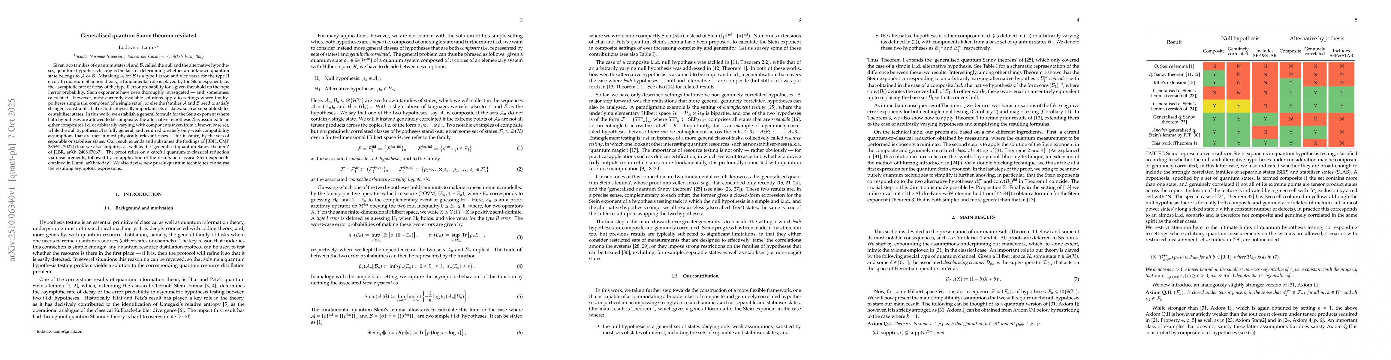 The paper introduces a novel framework for quantum hypothesis testing that combines quantum-to-classical reductions with classical Sanov theorems, enabling the derivation of regularized Stein exponents for complex composite hypothesis scenarios.