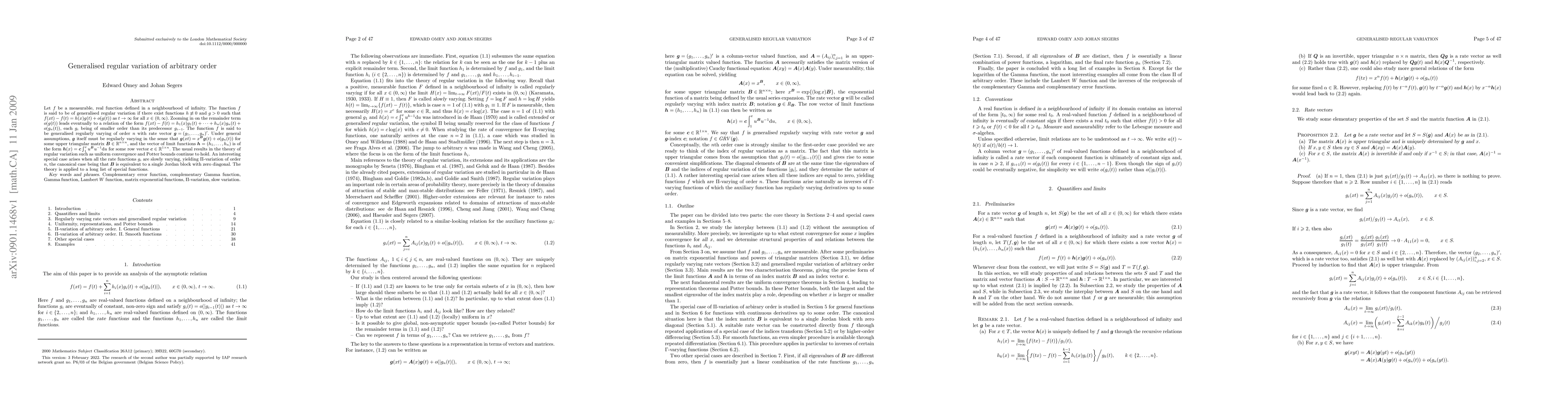 Let $f$ be a measurable, real function defined in a neighbourhood of infinity. The function $f$ is said to be of generalised regular variation if there exist functions $h \not\equiv 0$ and $g > 0$ such that $f(xt) - f(t) = h(x) g(t) + o(g(t))$ as $t \to \infty$ for all $x \in (0, \infty)$. Zooming in on the remainder term $o(g(t))$ leads eventually to a relation of the form $f(xt) - f(t) = h_1(x) g_1(t) + ... + h_n(x) g_n(t) + o(g_n(t))$, each $g_i$ being of smaller order than its predecessor $g_{i-1}$. The function $f$ is said to be generalised regularly varying of order $n$ with rate vector $\g = (g_1, >..., g_n)'$. Under general assumptions, $\g$ itself must be regularly varying in the sense that $\g(xt) = x^{\B} \g(t) + o(g_n(t))$ for some upper triangular matrix $\B \in \RR^{n \times n}$, and the vector of limit functions $\h = (h_1, >..., h_n)$ is of the form $\h(x) = \c \int_1^x u^\B u^{-1} \du$ for some row vector $\c \in \RR^{1 \times n}$. The usual results in the theory of regular variation such as uniform convergence and Potter bounds continue to hold. An interesting special case arises when all the rate functions $g_i$ are slowly varying, yielding $\Pi$-variation of order $n$, the canonical case being that $\B$ is equivalent to a single Jordan block with zero diagonal. The theory is applied to a long list of special functions.