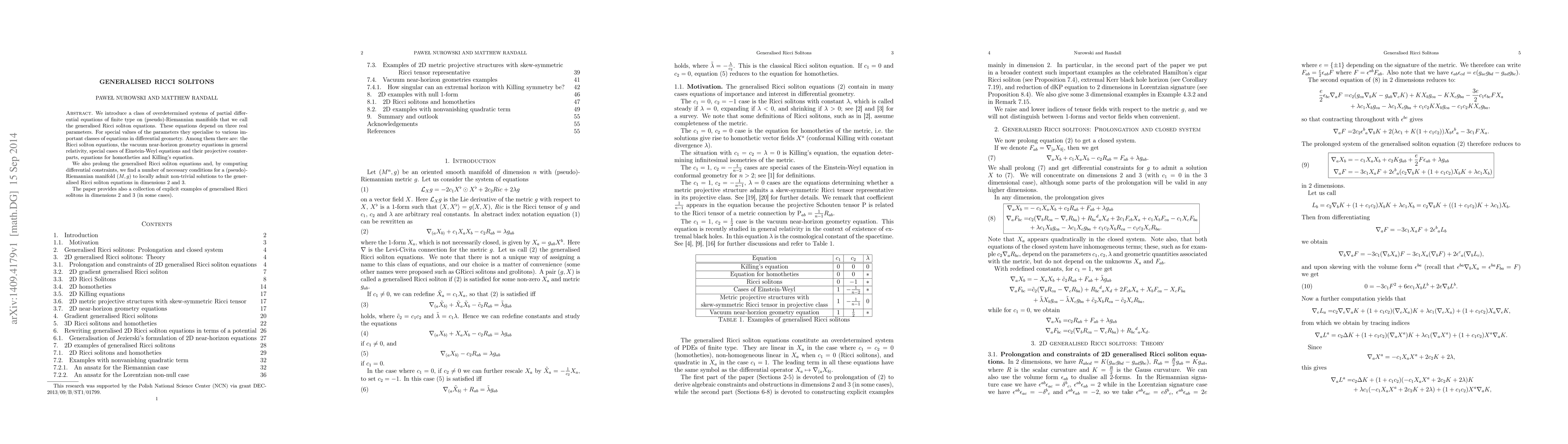 We introduce a class of overdetermined systems of partial differential equations of finite type on (pseudo)-Riemannian manifolds that we call the generalised Ricci soliton equations. These equations depend on three real parameters. For special values of the parameters they specialise to various important classes of equations in differential geometry. Among them there are: the Ricci soliton equations, the vacuum near-horizon geometry equations in general relativity, special cases of Einstein-Weyl equations and their projective counterparts, equations for homotheties and Killing's equation. We also prolong the generalised Ricci soliton equations and, by computing differential constraints, we find a number of necessary conditions for a (pseudo)-Riemannian manifold $(M, g)$ to locally admit non-trivial solutions to the generalised Ricci soliton equations in dimensions 2 and 3. The paper provides also a collection of explicit examples of generalised Ricci solitons in dimensions 2 and 3 (in some cases).