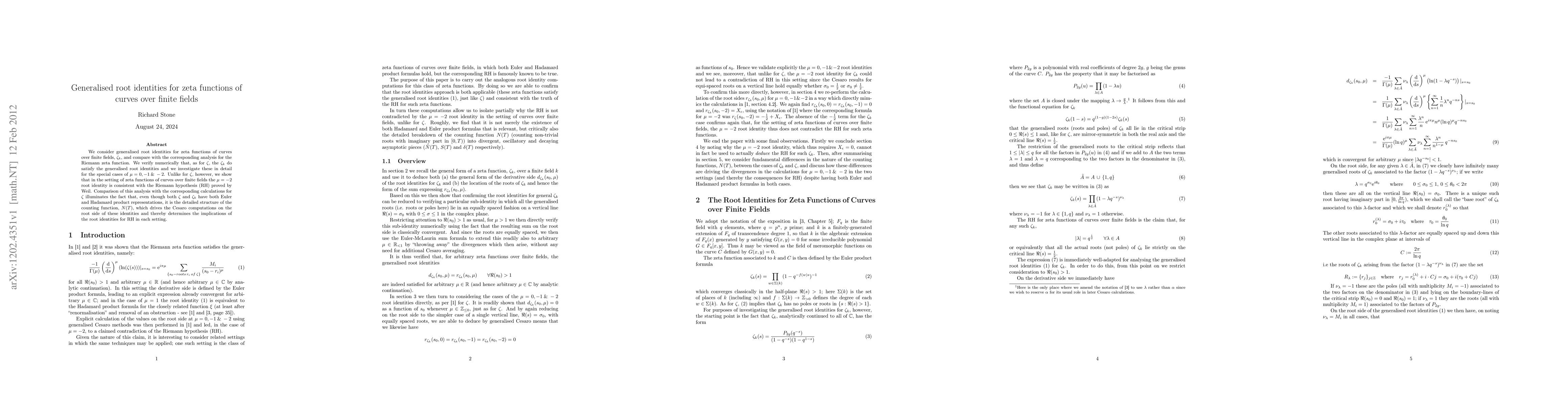 We consider generalised root identities for zeta functions of curves over finite fields, \zeta_{k}, and compare with the corresponding analysis for the Riemann zeta function. We verify numerically that, as for \zeta, the \zeta_{k} do satisfy the generalised root identities and we investigate these in detail for the special cases of \mu=0,-1\:\&\:-2. Unlike for \zeta, however, we show that in the setting of zeta functions of curves over finite fields the \mu=-2 root identity is consistent with the Riemann hypothesis (RH) proved by Weil. Comparison of this analysis with the corresponding calculations for \zeta illuminates the fact that, even though both \zeta and \zeta_{k} have both Euler and Hadamard product representations, it is the detailed structure of the counting function, N(T), which drives the Cesaro computations on the root side of these identities and thereby determines the implications of the root identities for RH in each setting.