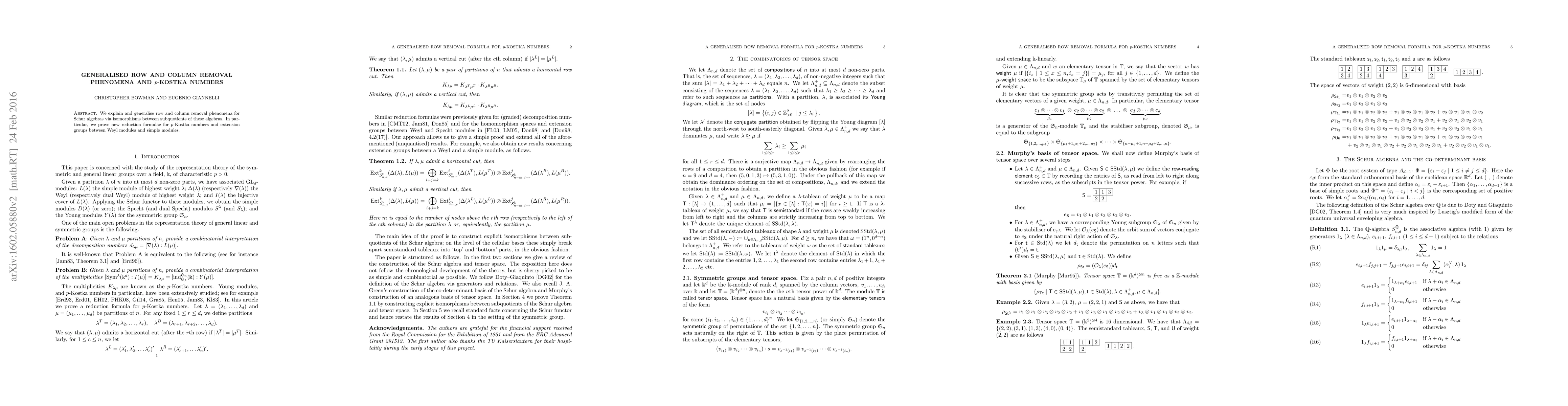 This paper generalises row-removal phenomena in Schur algebras and establishes new reduction formulae for $p$-Kostka numbers, providing insights into the structure of extension groups between Weyl and simple modules.