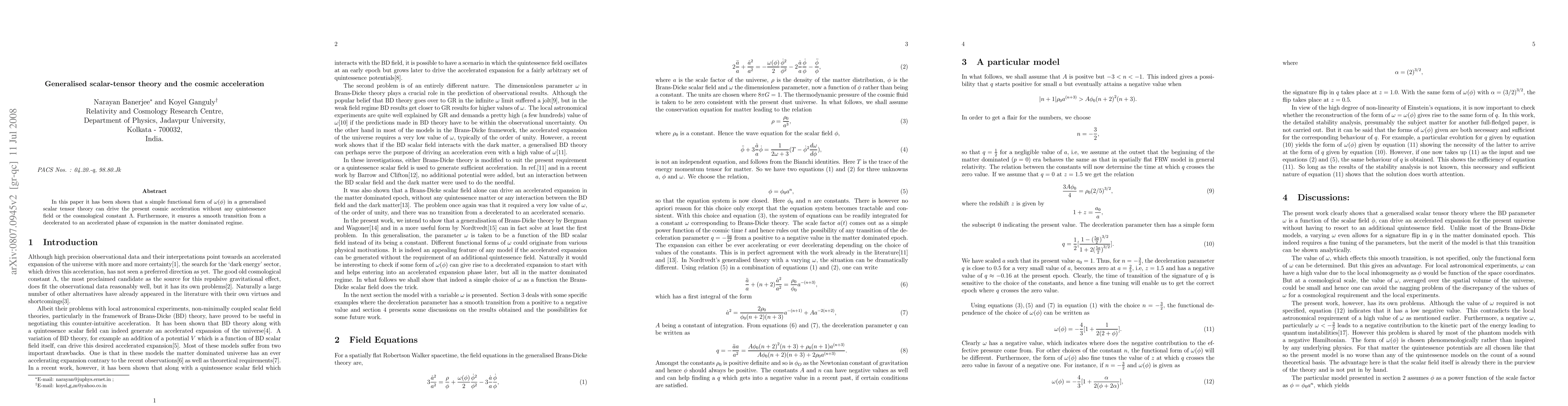 This paper demonstrates that a specific form of $\omega(\phi)$ in generalised scalar-tensor theory can cause cosmic acceleration without requiring quintessence fields or a cosmological constant, while also facilitating a smooth transition from decelerated to accelerated expansion in the matter-dominated era.