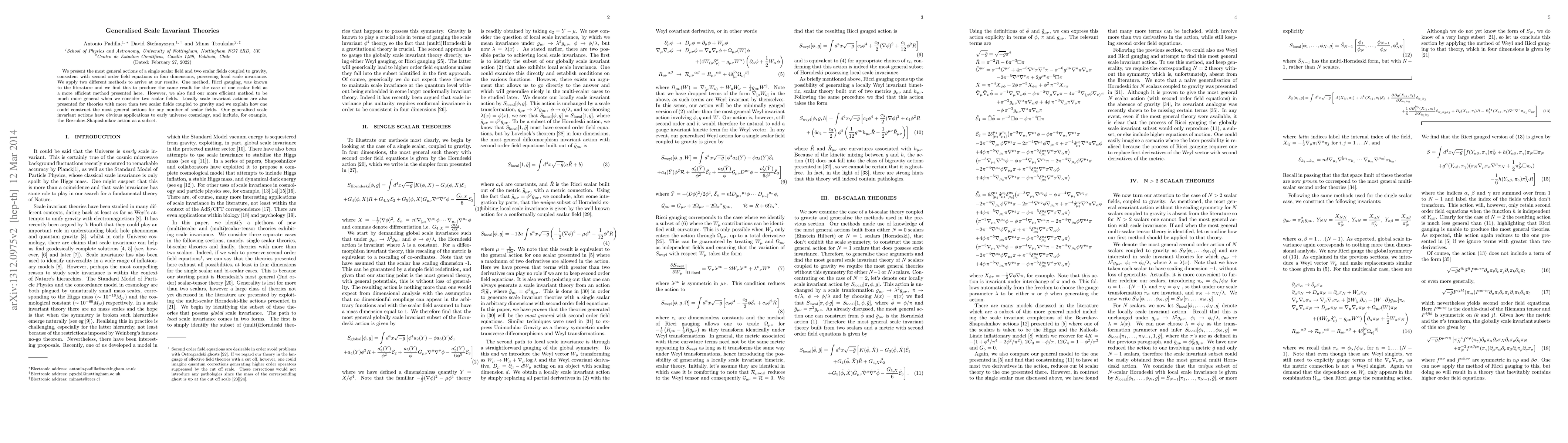 We present the most general actions of a single scalar field and two scalar fields coupled to gravity, consistent with second order field equations in four dimensions, possessing local scale invariance. We apply two different methods to arrive at our results. One method, Ricci gauging, was known to the literature and we find this to produce the same result for the case of one scalar field as a more efficient method presented here. However, we also find our more efficient method to be much more general when we consider two scalar fields. Locally scale invariant actions are also presented for theories with more than two scalar fields coupled to gravity and we explain how one could construct the most general actions for any number of scalar fields. Our generalised scale invariant actions have obvious applications to early universe cosmology, and include, for example, the Bezrukov-Shaposhnikov action as a subset.