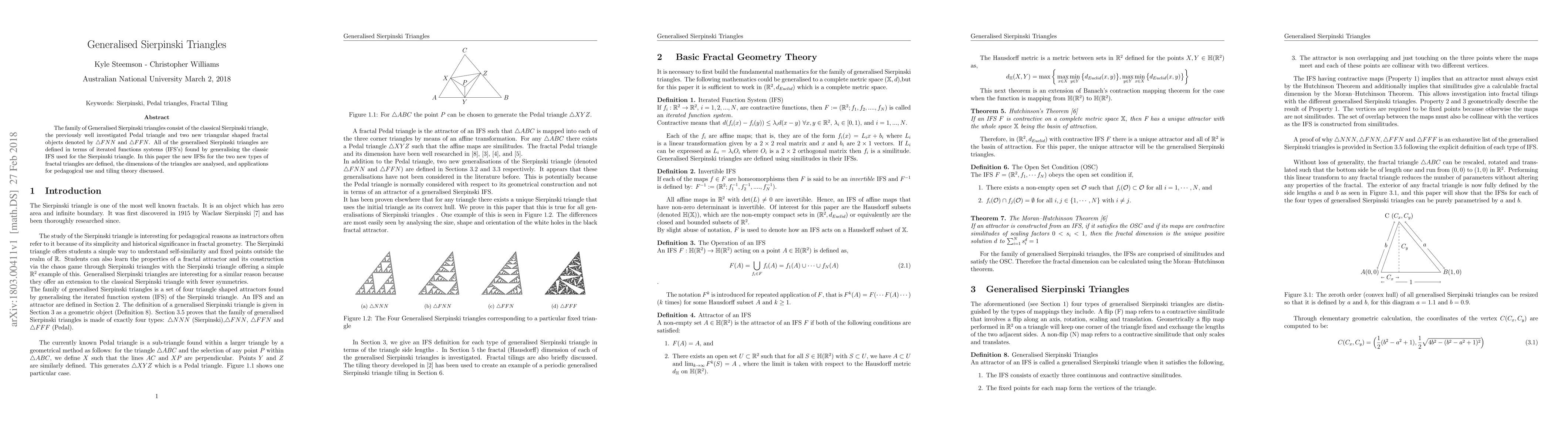 This paper introduces new generalised Sierpinski triangles, including the Pedal triangle and two novel fractals, $\triangle FNN$ and $\triangle FFN$, defined via iterated function systems. It analyses their dimensions and explores applications in education and tiling theory.