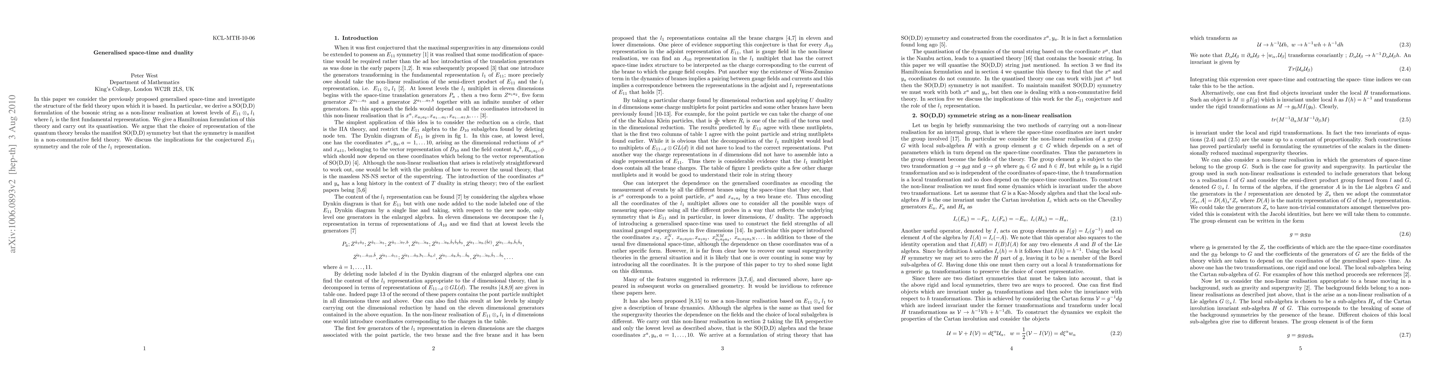 In this paper we consider the previously proposed generalised space-time and investigate the structure of the field theory upon which it is based. In particular, we derive a SO(D,D) formulation of the bosonic string as a non-linear realisation at lowest levels of the semi-direct product of E11 with the first fundamental representation l1. We give a Hamiltonian formulation of this theory and carry out its quantisation. We argue that the choice of representation of the quantum theory breaks the manifest SO(D,D) symmetry but that the symmetry is manifest in a non-commutative field theory. We discuss the implications for the conjectured E11 symmetry and the role of the l1 representation.