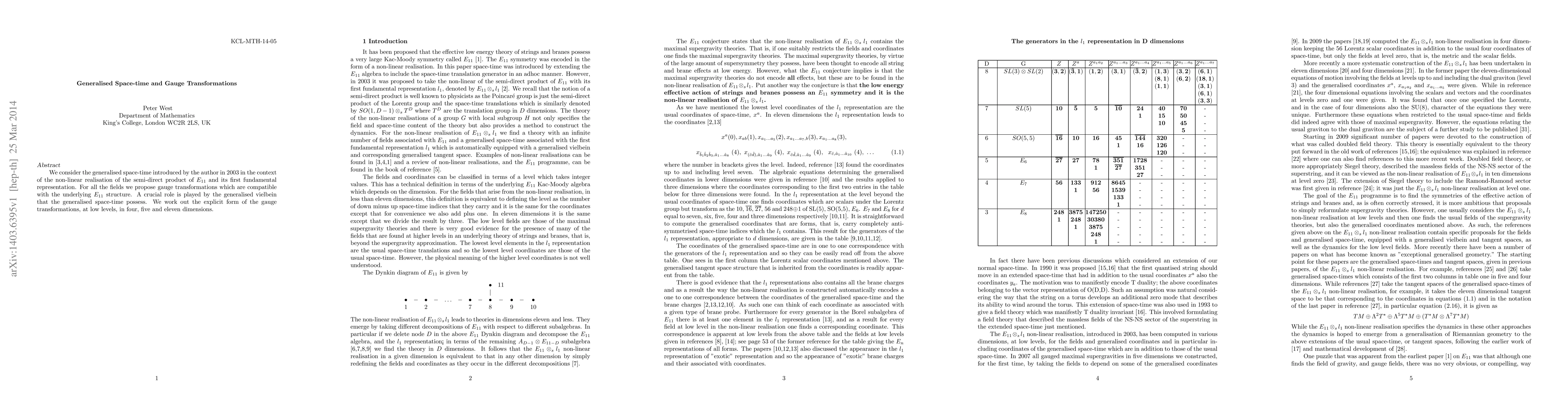 We consider the generalised space-time introduced by the author in 2003 in the context of the non-linear realisation of the semi-direct product of E11 and its first fundamental representation. For all the fields we propose gauge transformations which are compatible with the underlying E11 structure. A crucial role is played by the generalised vielbein that the generalised space-time possess. We work out the explicit form of the gauge transformations, at low levels, in four, five and eleven dimensions.