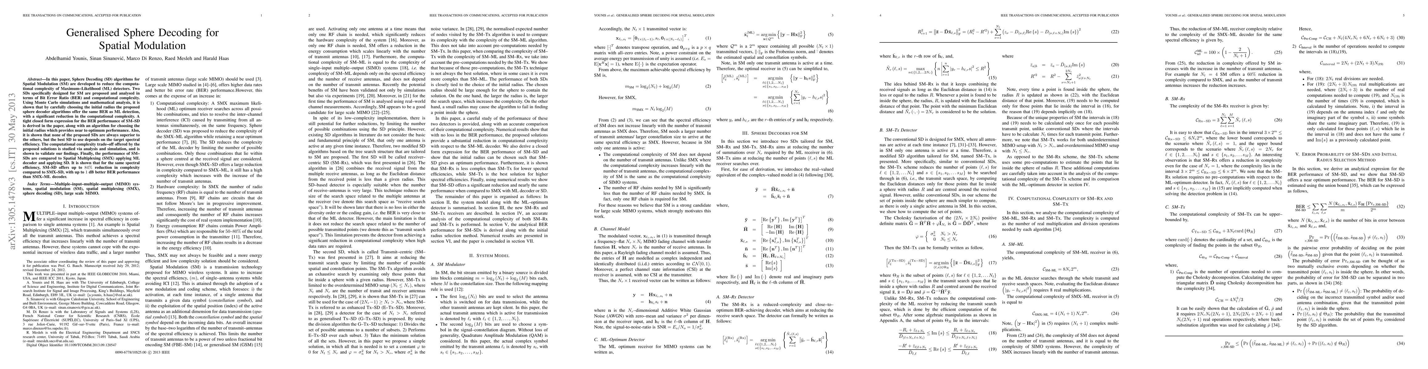 In this paper, Sphere Decoding (SD) algorithms for Spatial Modulation (SM) are developed to reduce the computational complexity of Maximum-Likelihood (ML) detectors. Two SDs specifically designed for SM are proposed and analysed in terms of Bit Error Ratio (BER) and computational complexity. Using Monte Carlo simulations and mathematical analysis, it is shown that by carefully choosing the initial radius the proposed sphere decoder algorithms offer the same BER as ML detection, with a significant reduction in the computational complexity. A tight closed form expression for the BER performance of SM-SD is derived in the paper, along with an algorithm for choosing the initial radius which provides near to optimum performance. Also, it is shown that none of the proposed SDs are always superior to the others, but the best SD to use depends on the target spectral efficiency. The computational complexity trade-off offered by the proposed solutions is studied via analysis and simulation, and is shown to validate our findings. Finally, the performance of SM-SDs are compared to Spatial Multiplexing (SMX) applying ML decoder and applying SD. It is shown that for the same spectral efficiency, SM-SD offers up to 84% reduction in complexity compared to SMX-SD, with up to 1 dB better BER performance than SMX-ML decoder.