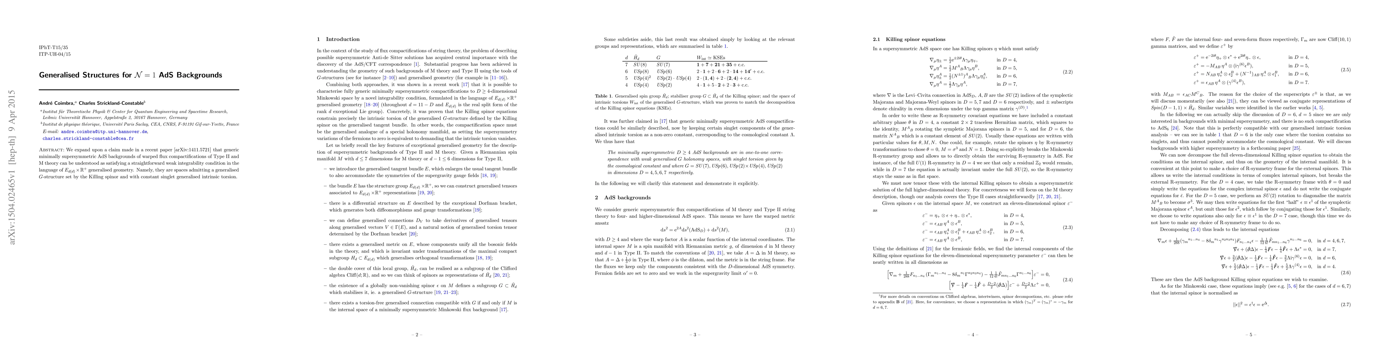 This paper explores the generalised geometric structures underpinning $\mathcal{N}=1$ AdS backgrounds in Type II and M theory, asserting that these backgrounds satisfy a weak integrability condition in $E_{d(d)}\times\mathbb{R}^+$ generalised geometry, defined by a Killing spinor and constant generalised intrinsic torsion.