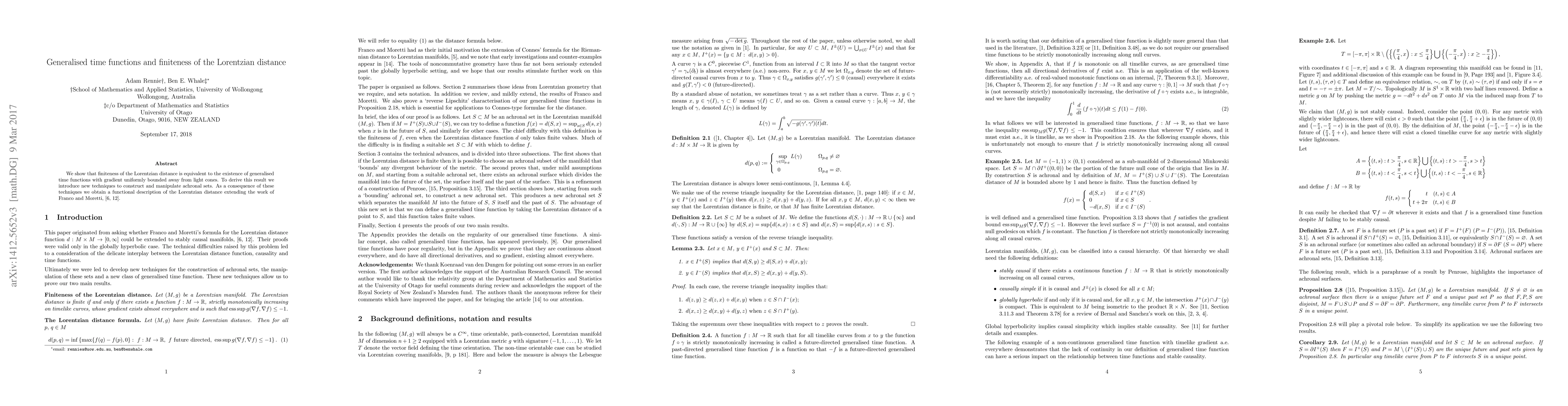 We show that finiteness of the Lorentzian distance is equivalent to the existence of generalised time functions with gradient uniformly bounded away from light cones. To derive this result we introduce new techniques to construct and manipulate achronal sets. As a consequence of these techniques we obtain a functional description of the Lorentzian distance extending the work of Franco and Moretti.