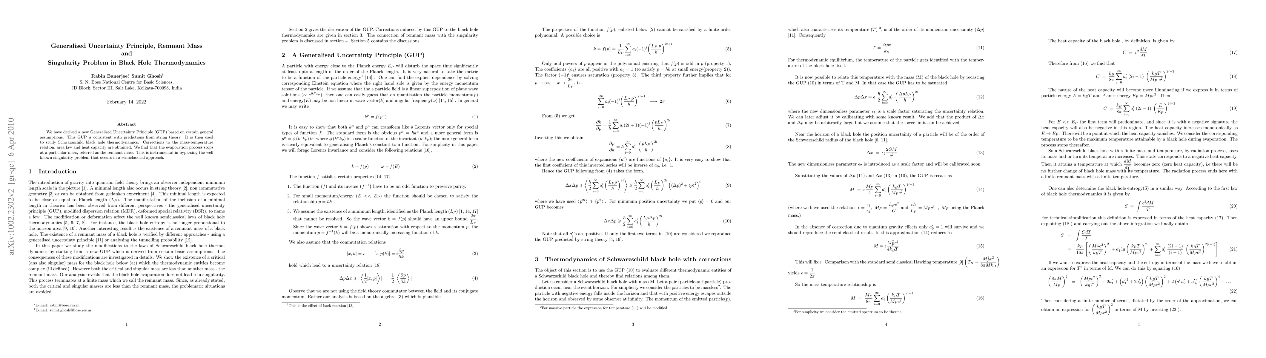 We have derived a new Generalised Uncertainty Principle (GUP) based on certain general assumptions. This GUP is consistent with predictions from string theory. It is then used to study Schwarzschild black hole thermodynamics. Corrections to the mass-temperature relation, area law and heat capacity are obtained. We find that the evaporation process stops at a particular mass, referred as the remnant mass. This is instrumental in bypassing the well known singularity problem that occurs in a semiclassical approach.