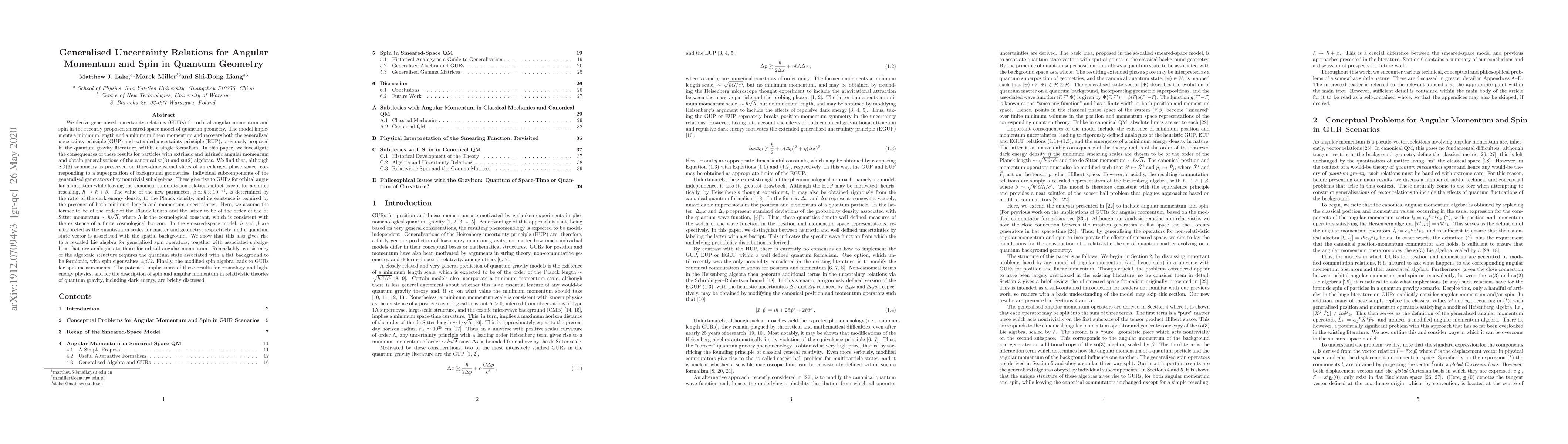 We derive generalised uncertainty relations (GURs) for angular momentum and spin in the smeared-space model of quantum geometry. The model implements a minimum length and a minimum linear momentum, and recovers both the generalised uncertainty principle (GUP) and the extended uncertainty principle (EUP) within a single formalism. In this paper, we investigate the consequences of these results for particles with extrinsic and intrinsic angular momentum, and obtain generalisations of the canonical ${\rm so(3)}$ and ${\rm su(2)}$ algebras. We find that, although ${\rm SO(3)}$ symmetry is preserved on three-dimensional slices of an enlarged phase space, individual subcomponents of the generalised generators obey nontrivial subalgebras. These give rise to GURs for angular momentum while leaving the canonical commutation relations intact except for a simple rescaling, $\hbar \rightarrow \hbar + \beta$. The value of the new parameter, $\beta \simeq \hbar \times 10^{-61}$, is determined by the ratio of the dark energy density to the Planck density. Here, we assume the former to be of the order of the Planck length and the latter to be of the order of the de Sitter momentum $\sim \hbar\sqrt{\Lambda}$, where $\Lambda$ is the cosmological constant. In the smeared-space model, $\hbar$ and $\beta$ are interpreted as the quantisation scales for matter and geometry, respectively, and a quantum state vector is associated with the spatial background. We show that this also gives rise to a rescaled Lie algebra for generalised spin operators, together with associated subalgebras that are analogous to those for orbital angular momentum. Remarkably, consistency of the algebraic structure requires the quantum state associated with a flat background to be fermionic, with spin eigenvalues $\pm \beta/2$. Finally, the modified spin algebra leads to GURs for spin measurements.