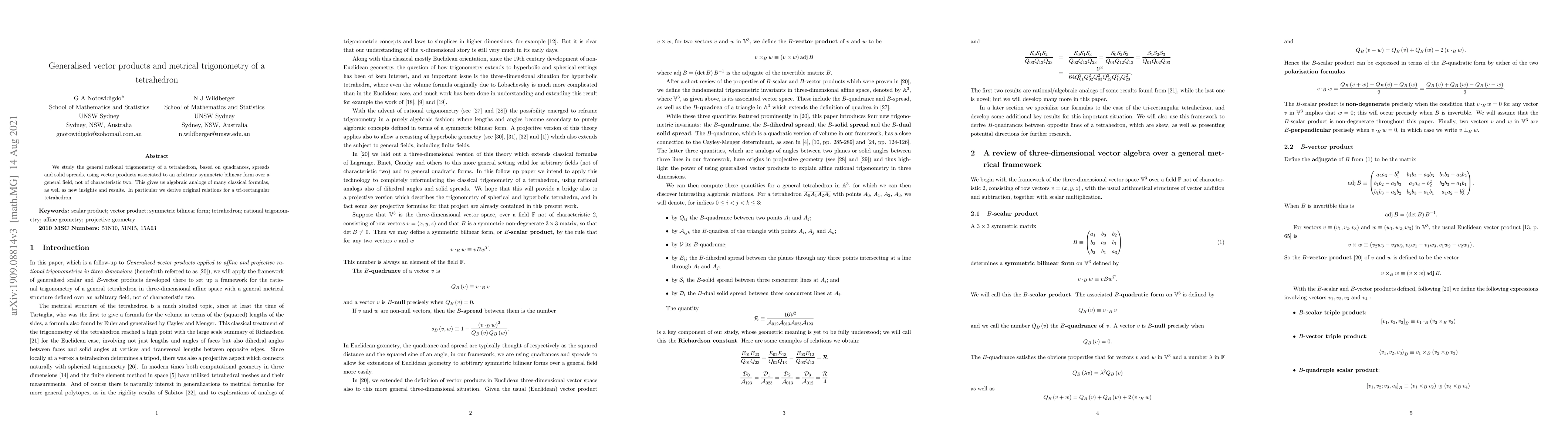 We study the general rational trigonometry of a tetrahedron, based on quadrances, spreads and solid spreads, using vector products associated to an arbitrary symmetric bilinear form over a general field, not of characteristic two. This gives us algebraic analogs of many classical formulas, as well as new insights and results. In particular we derive original relations for a tri-rectangular tetrahedron.