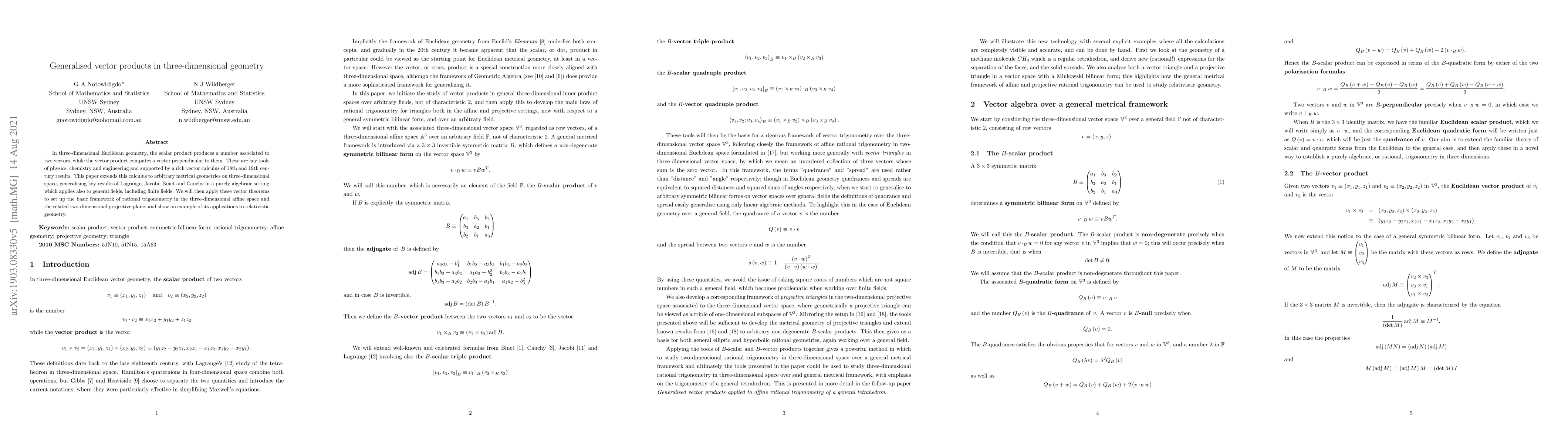 In three-dimensional Euclidean geometry, the scalar product produces a number associated to two vectors, while the vector product computes a vector perpendicular to them. These are key tools of physics, chemistry and engineering and supported by a rich vector calculus of 18th and 19th century results. This paper extends this calculus to arbitrary metrical geometries on three-dimensional space, generalising key results of Lagrange, Jacobi, Binet and Cauchy in a purely algebraic setting which applies also to general fields, including finite fields. We will then apply these vector theorems to set up the basic framework of rational trigonometry in the three-dimensional affine space and the related two-dimensional projective plane, and show an example of its applications to relativistic geometry.