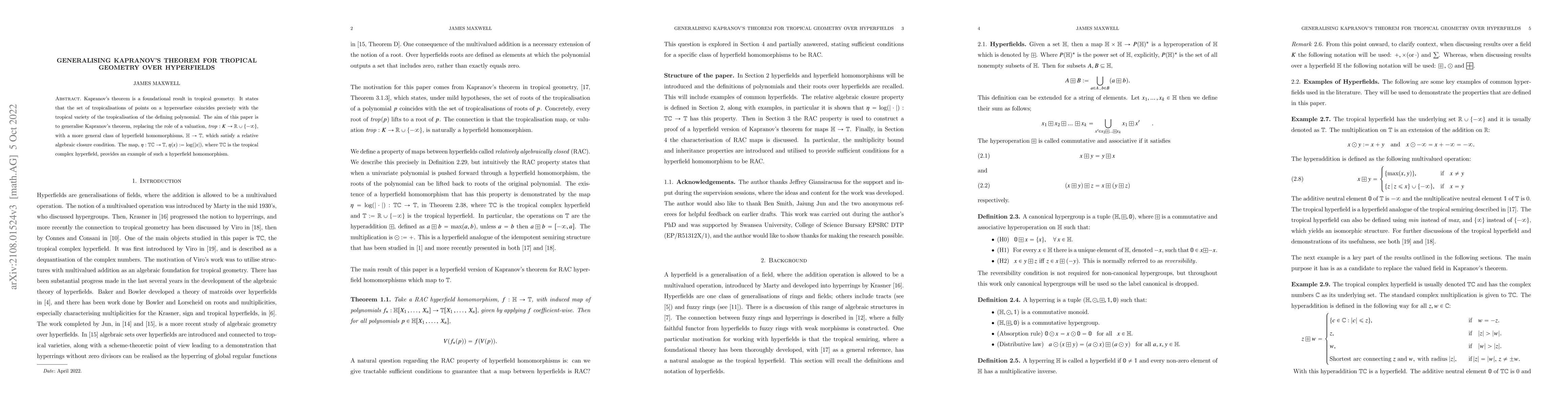 Kapranov's theorem is a foundational result in tropical geometry. It states that the set of tropicalisations of points on a hypersurface coincides precisely with the tropical variety of the tropicalisation of the defining polynomial. The aim of this paper is to generalise Kapranov's theorem, replacing the role of a valuation map, from a field to the real numbers union negative infinity, with a more general class of hyperfield homomorphisms, whose target is the tropical hyperfield and satisfy a relative algebraic closure condition. To provide an example of such a hyperfield homomorphism, the map from the complex tropical hyperfield to the tropical hyperfield is investigated. There is a brief outline of sufficient conditions for a hyperfield homomorphism to satisfy the relative algebraic closure condition.
