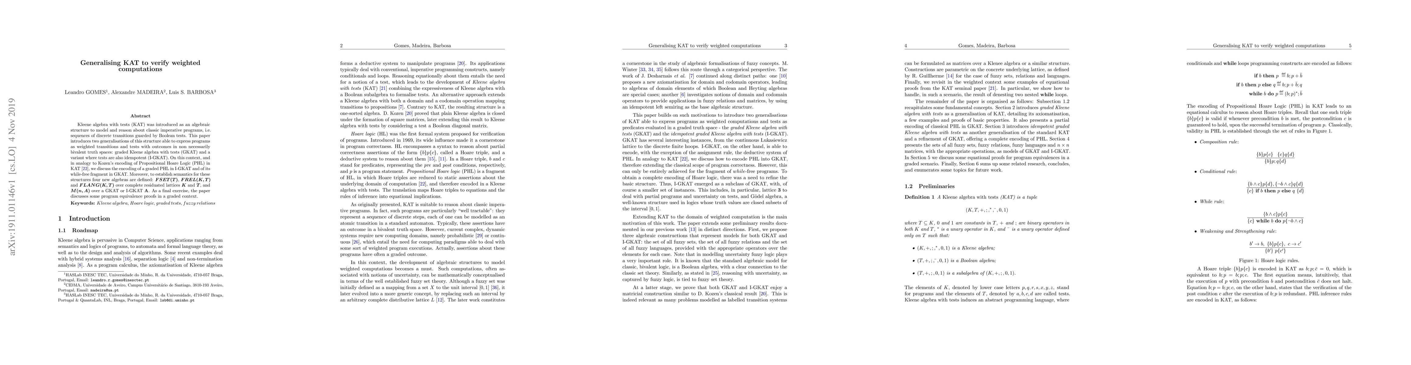 Kleene algebra with tests (KAT) was introduced as an algebraic structure to model and reason about classic imperative programs, i.e. sequences of discrete transitions guarded by Boolean tests. This paper introduces two generalisations of this structure able to express programs as weighted transitions and tests with outcomes in non necessarily bivalent truth spaces: graded Kleene algebra with tests (GKAT) and a variant where tests are also idempotent (I-GKAT). On this context, and in analogy to Kozen's encoding of Propositional Hoare Logic (PHL) in KAT [22], we discuss the encoding of a graded PHL in I-GKAT and of its while-free fragment in GKAT. Moreover, to establish semantics for these structures four new algebras are defined: FSET(T), FREL(K,T) and FLANG(K,T) over complete residuated lattices K and T, and M(n,A) over a GKAT or I-GKAT A. As a final exercise, the paper discusses some program equivalence proofs in a graded context.