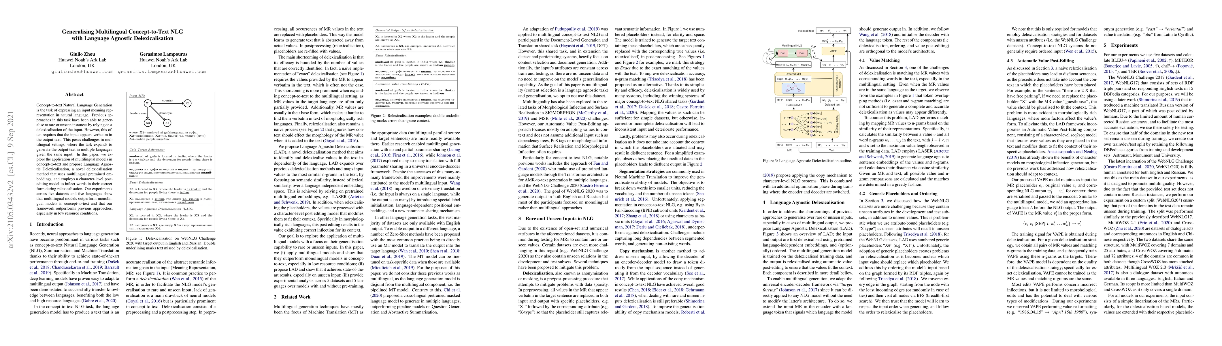 This paper proposes a Language Agnostic Delexicalisation method for multilingual concept-to-text Natural Language Generation, using multilingual pretrained embeddings and a character-level post-editing model. Experiments show that this approach outperforms previous methods, especially for low-resource languages.