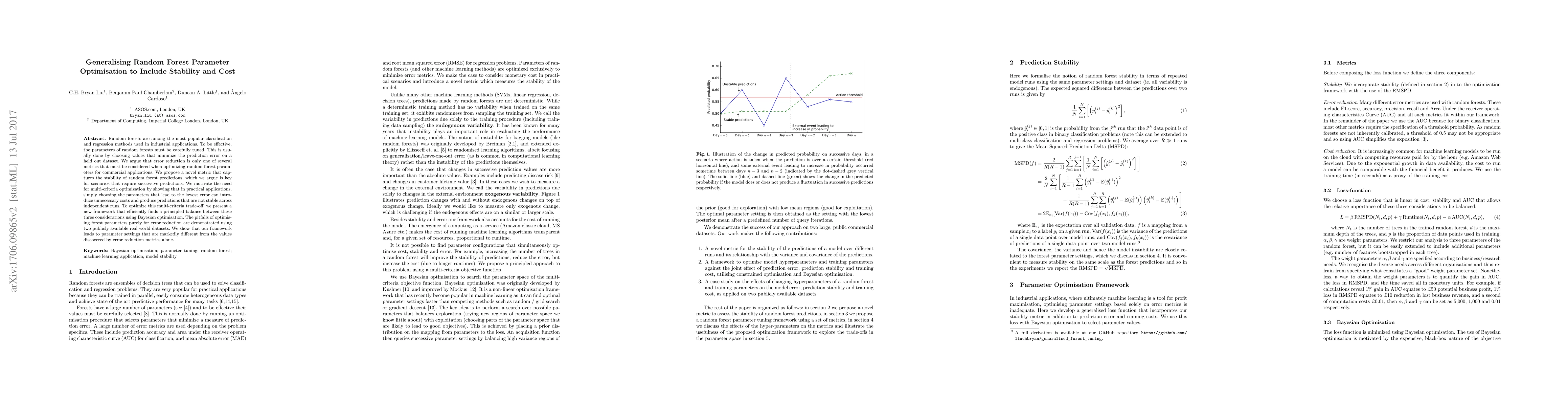 This research is significant as it addresses the limitation of solely optimizing random forest parameters for error reduction, which can introduce unnecessary costs and instability in predictions. It provides a framework for commercial applications requiring successive predictions, ensuring a balance between prediction accuracy, stability, and computational cost.