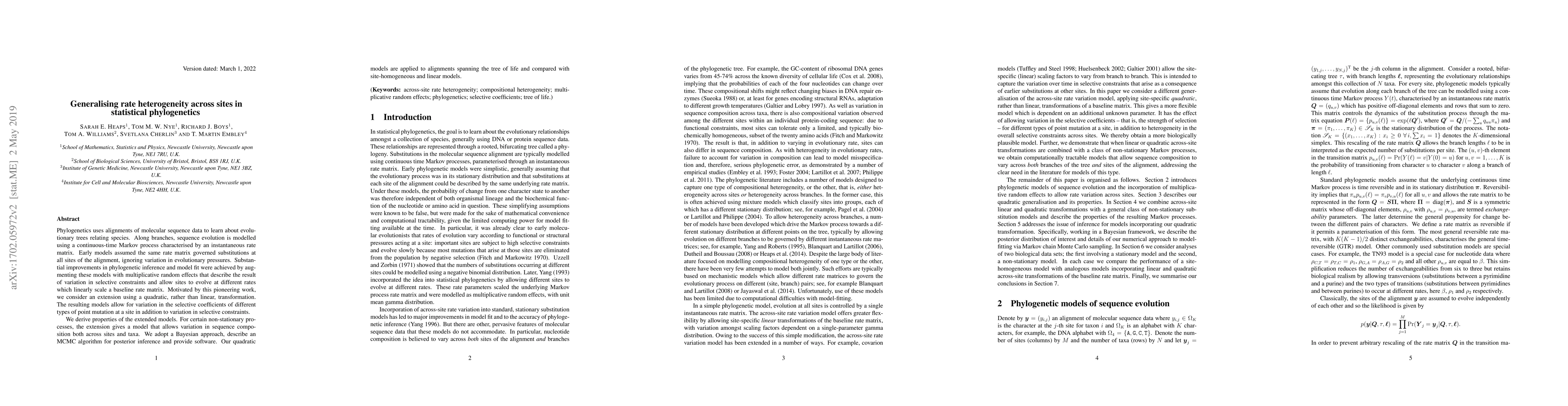 This paper proposes a quadratic extension to models of rate heterogeneity in phylogenetics, allowing for more complex evolutionary pressures across different sites. The authors develop a Bayesian MCMC algorithm for inference and demonstrate improved model fit and phylogenetic inference compared to linear and site-homogeneous models.