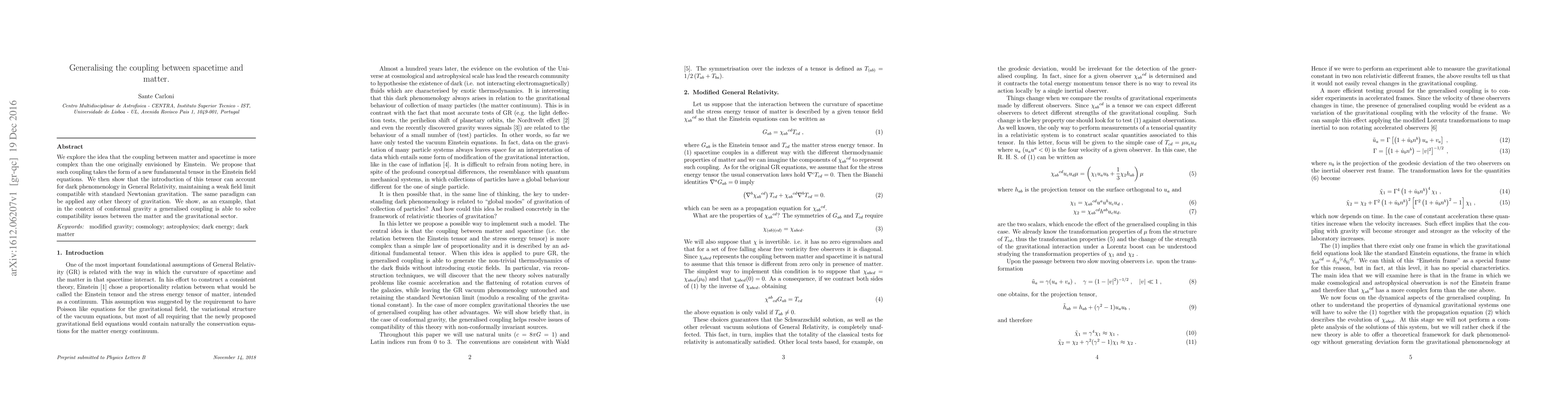 We explore the idea that the coupling between matter and spacetime is more complex than the one originally envisioned by Einstein. We propose that such coupling takes the form of a new fundamental tensor in the Einstein field equations. We then show that the introduction of this tensor can account for dark phenomenology in General Relativity, maintaining a weak field limit compatible with standard Newtonian gravitation. The same paradigm can be applied any other theory of gravitation. We show, as an example, that in the context of conformal gravity a generalised coupling is able to solve compatibility issues between the matter and the gravitational sector.