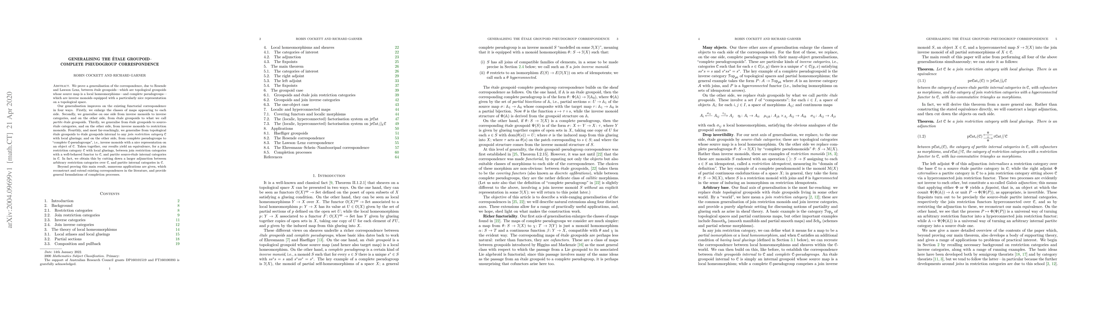 We prove a generalisation of the correspondence, due to Resende and Lawson--Lenz, between \'etale groupoids---which are topological groupoids whose source map is a local homeomorphisms---and complete pseudogroups---which are inverse monoids equipped with a particularly nice representation on a topological space. Our generalisation improves on the existing functorial correspondence in four ways. Firstly, we enlarge the classes of maps appearing to each side. Secondly, we generalise on one side from inverse monoids to inverse categories, and on the other side, from \'etale groupoids to what we call partite \'etale groupoids. Thirdly, we generalise from \'etale groupoids to source-\'etale categories, and on the other side, from inverse monoids to restriction monoids. Fourthly, and most far-reachingly, we generalise from topological \'etale groupoids to \'etale groupoids internal to any join restriction category C with local glueings; and on the other side, from complete pseudogroups to ``complete C-pseudogroups'', i.e., inverse monoids with a nice representation on an object of C. Taken together, our results yield an equivalence, for a join restriction category C with local glueings, between join restriction categories with a well-behaved functor to C, and partite source-\'etale internal categories in C. In fact, we obtain this by cutting down a larger adjunction between arbitrary restriction categories over C, and partite internal categories in C. Beyond proving this main result, numerous applications are given, which reconstruct and extend existing correspondences in the literature, and provide general formulations of completion processes.