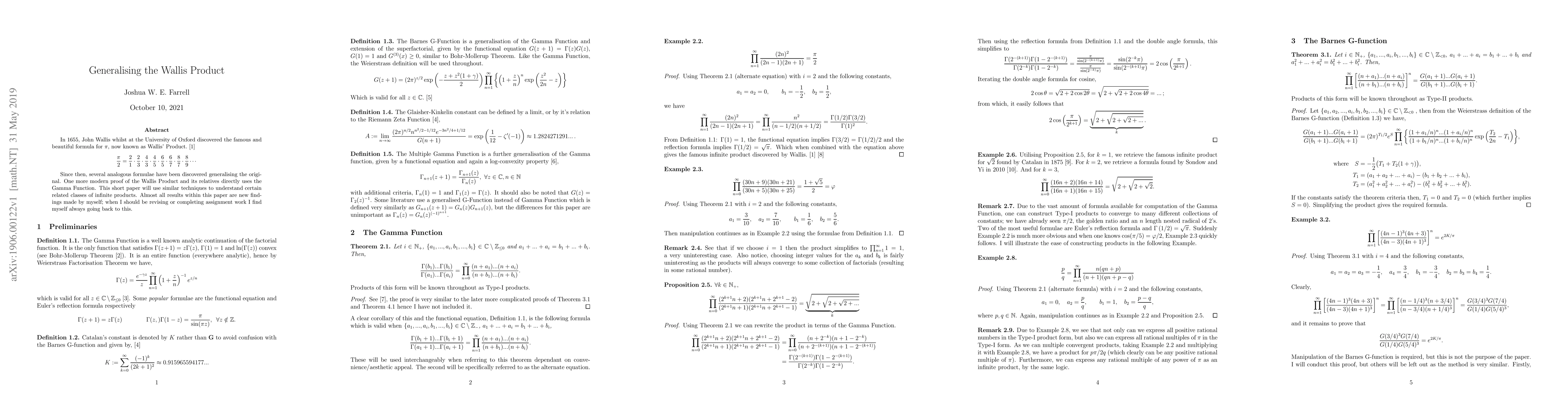 This paper explores modern proofs of the Wallis Product using the Gamma Function and extends these techniques to generalize related classes of infinite products, presenting new findings in the process. The author finds this research compelling enough to pursue despite other academic commitments.