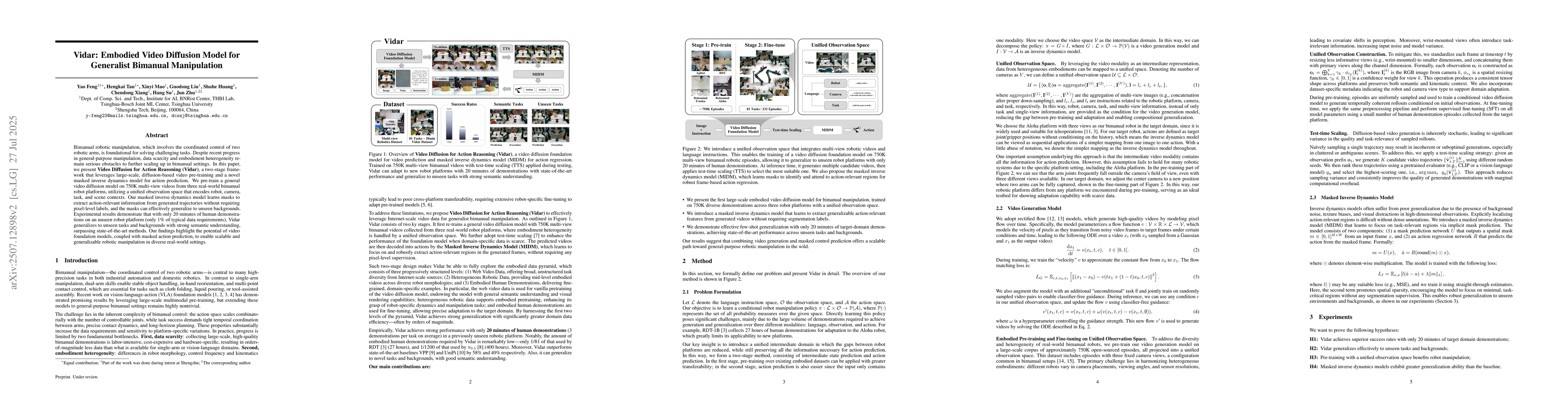 Bimanual robotic manipulation, which involves the coordinated control of two robotic arms, is foundational for solving challenging tasks. Despite recent progress in general-purpose manipulation, data scarcity and embodiment heterogeneity remain serious obstacles to further scaling up in bimanual settings. In this paper, we introduce VIdeo Diffusion for Action Reasoning (VIDAR), a two-stage framework that leverages large-scale, diffusion-based video pre-training and a novel masked inverse dynamics model for action prediction. We pre-train the video diffusion model on 750K multi-view videos from three real-world bimanual robot platforms, utilizing a unified observation space that encodes robot, camera, task, and scene contexts. Our masked inverse dynamics model learns masks to extract action-relevant information from generated trajectories without requiring pixel-level labels, and the masks can effectively generalize to unseen backgrounds. Our experiments demonstrate that with only 20 minutes of human demonstrations on an unseen robot platform (only 1% of typical data requirements), VIDAR generalizes to unseen tasks and backgrounds with strong semantic understanding, surpassing state-of-the-art methods. Our findings highlight the potential of video foundation models, coupled with masked action prediction, to enable scalable and generalizable robotic manipulation in diverse real-world settings.