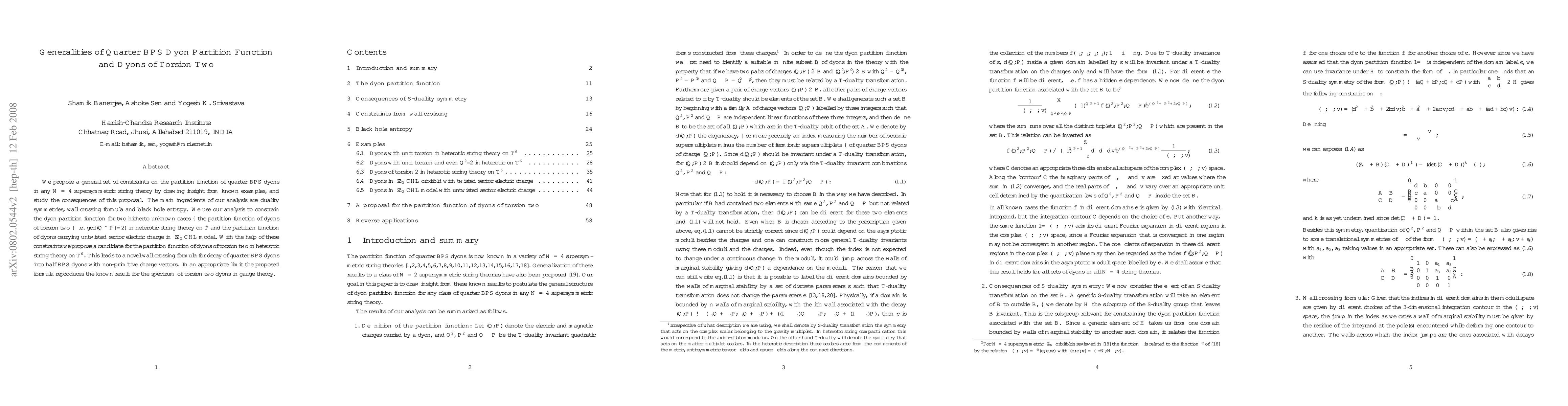 The paper proposes constraints on the partition function of quarter BPS dyons in N=4 supersymmetric string theories, using duality symmetries and black hole entropy. It also suggests a candidate partition function for dyons of torsion two in heterotic string theory on T^6, leading to a new wall crossing formula.