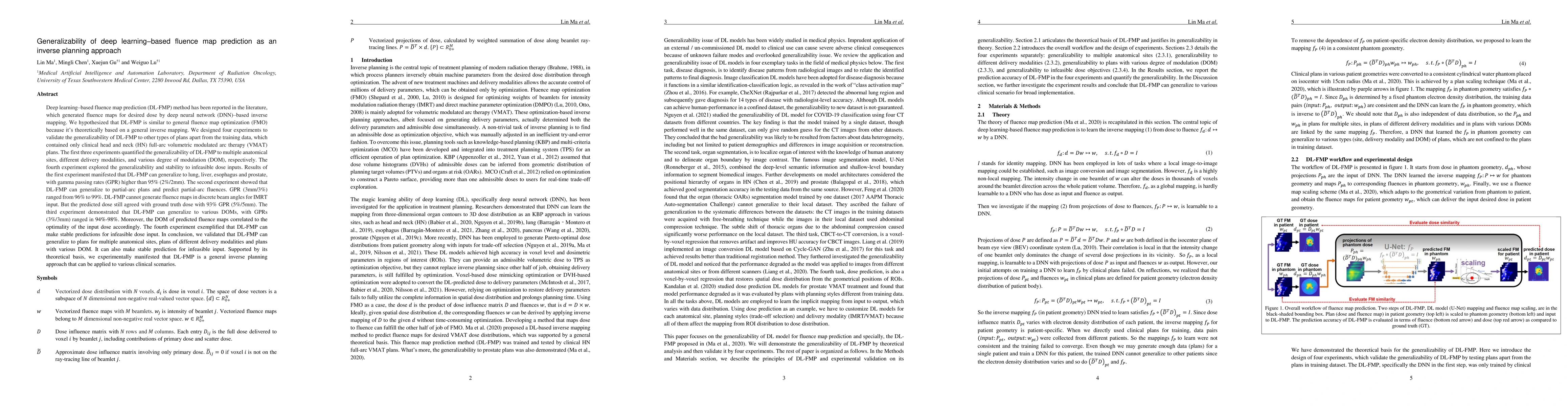Deep learning-based fluence map prediction(DL-FMP) method has been reported in the literature, which generated fluence maps for desired dose by deep neural network(DNN)-based inverse mapping. We hypothesized that DL-FMP is similar to general fluence map optimization(FMO) because it's theoretically based on a general inverse mapping. We designed four experiments to validate the generalizability of DL-FMP to other types of plans apart from the training data, which contained only clinical head and neck(HN) full-arc VMAT plans. The first three experiments quantified the generalizability of DL-FMP to multiple anatomical sites, different delivery modalities, and various degree of modulation(DOM), respectively. The fourth experiment explored the generalizability and stability to infeasible dose inputs. Results of the first experiment manifested that DL-FMP can generalize to lung, liver, esophagus and prostate, with gamma passing rates (GPR) higher than 95%(2%/2mm). The second experiment showed that DL-FMP can generalize to partial-arc plans and predict partial-arc fluences. GPR(3mm/3%) ranged from 96% to 99%. DL-FMP cannot generate fluence maps in discrete beam angles for IMRT input. But the predicted dose still agreed with ground truth dose with 93% GPR(5%/5mm). The third experiment demonstrated that DL-FMP can generalize to various DOMs, with GPRs(3%/3mm) ranged in 94%-98%. Moreover, the DOM of predicted fluence maps correlated to the optimality of the input dose accordingly. The fourth experiment exemplified that DL-FMP can make stable predictions for infeasible dose input. In conclusion, we validated that DL-FMP can generalize to plans for multiple anatomical sites, plans of different delivery modalities and plans with various DOM. It can also make stable prediction for infeasible input.